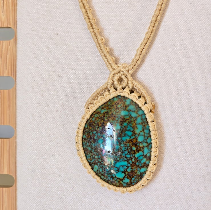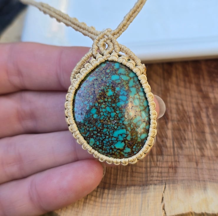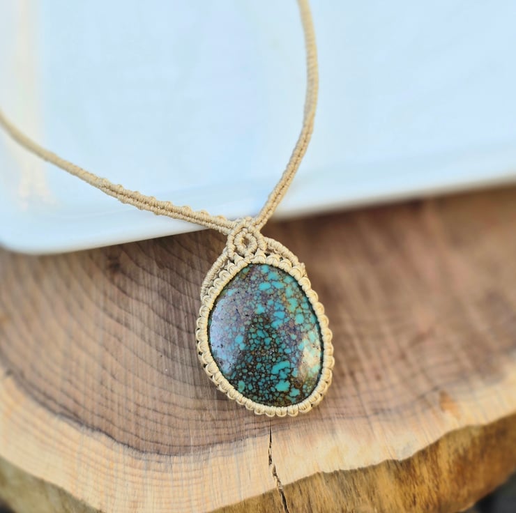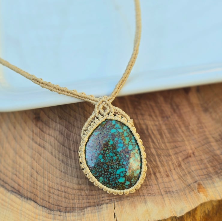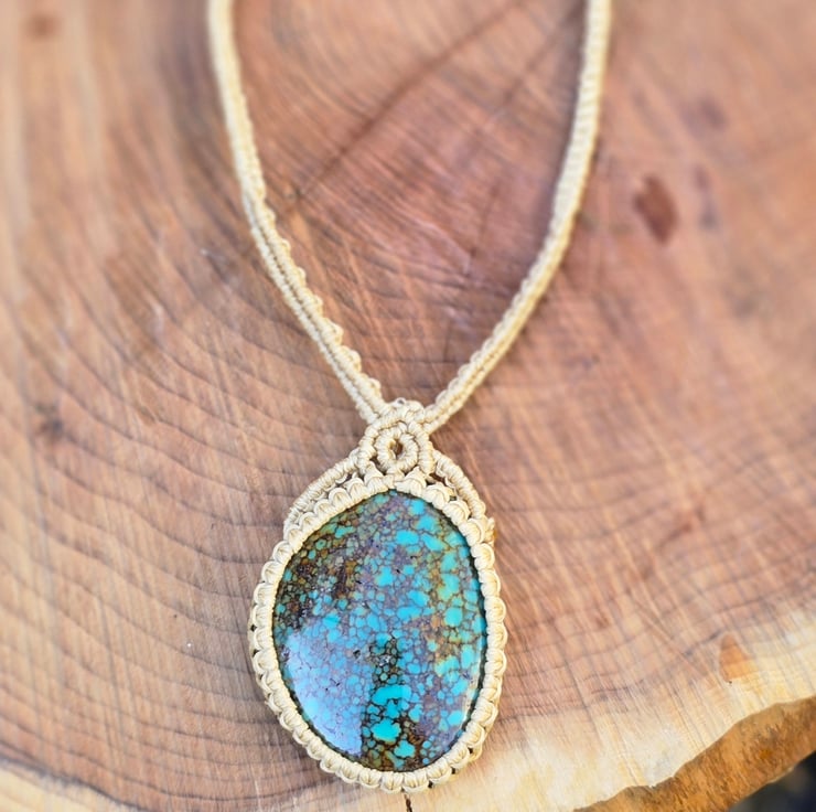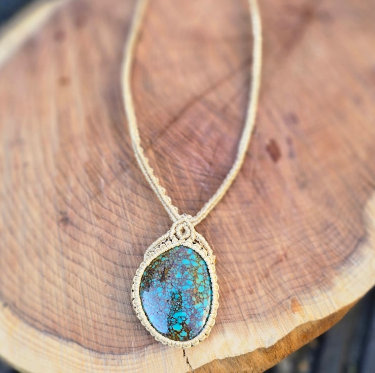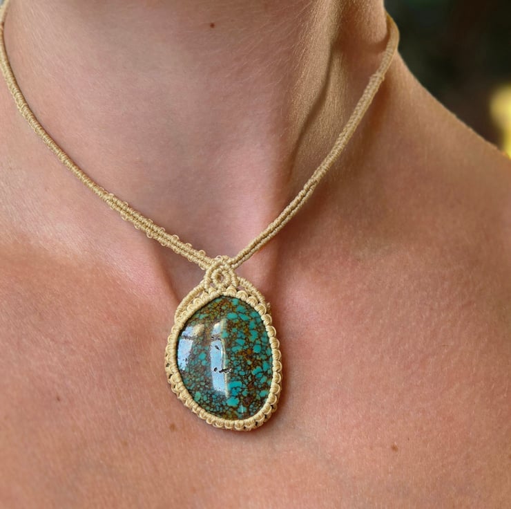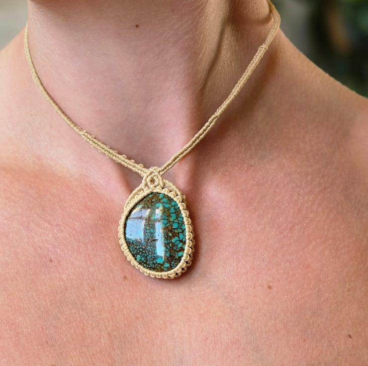 This handmade macrame necklace features a stunning genuine turquoise gemstone wrapped securely in natural beige cord. The earthy tones of the cord beautifully complement the rich blue green hues with brown veining of the stone, creating a piece that feels both organic and elegant.