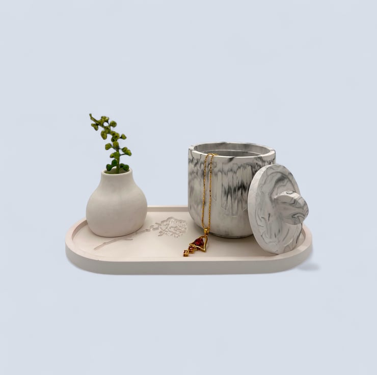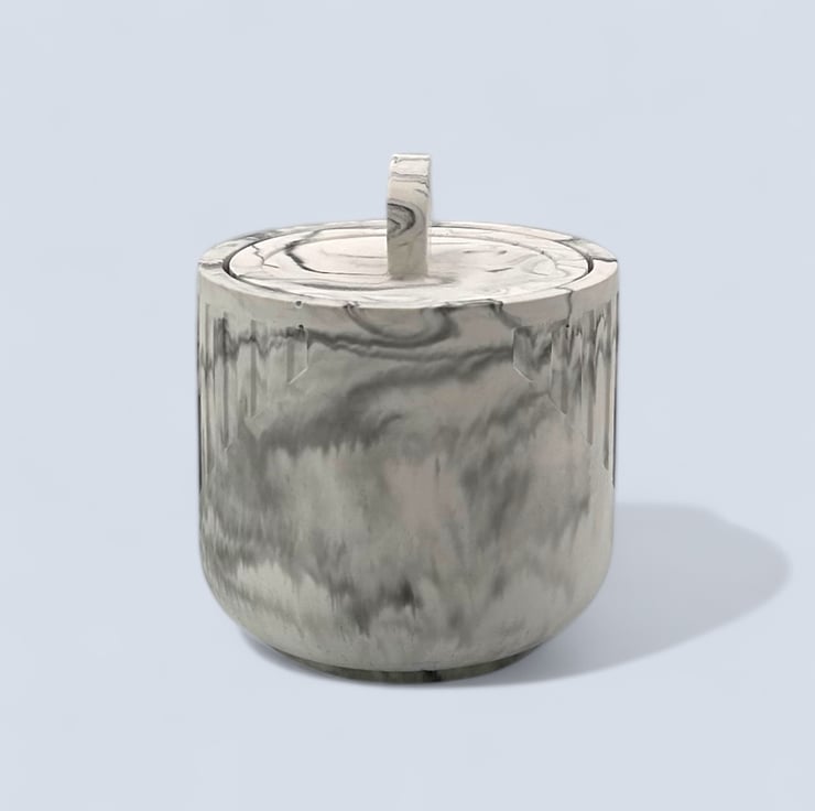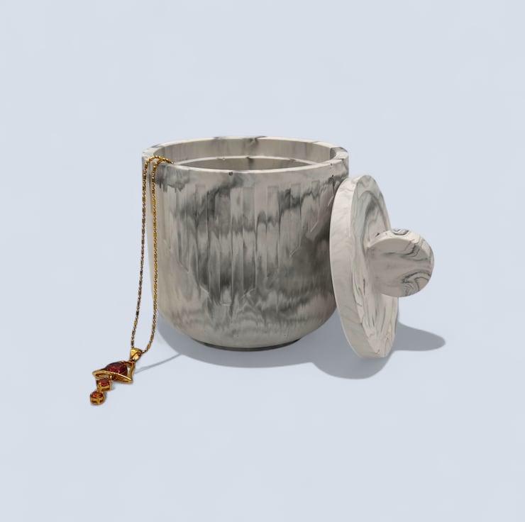 This trinket pot was inspired by the soft, drifting patterns of smoke and cloud. I wanted to capture that gentle movement in a marbled design that feels both calm and striking. As the plaster is poured and swirled, the greys spread across the white base in unpredictable ways, so every pot takes on its own unique character.