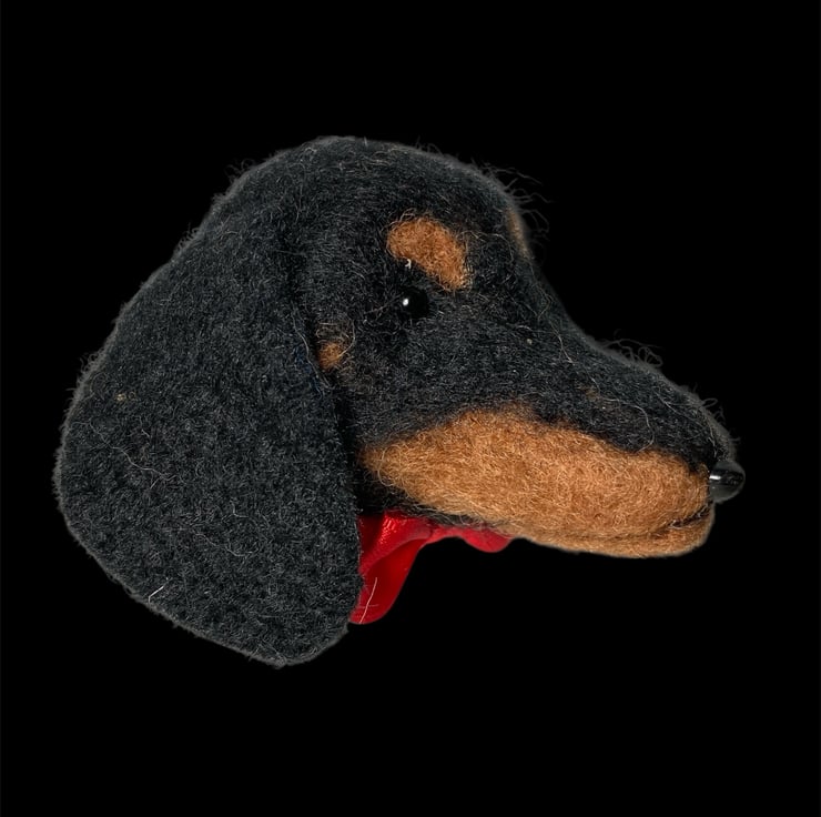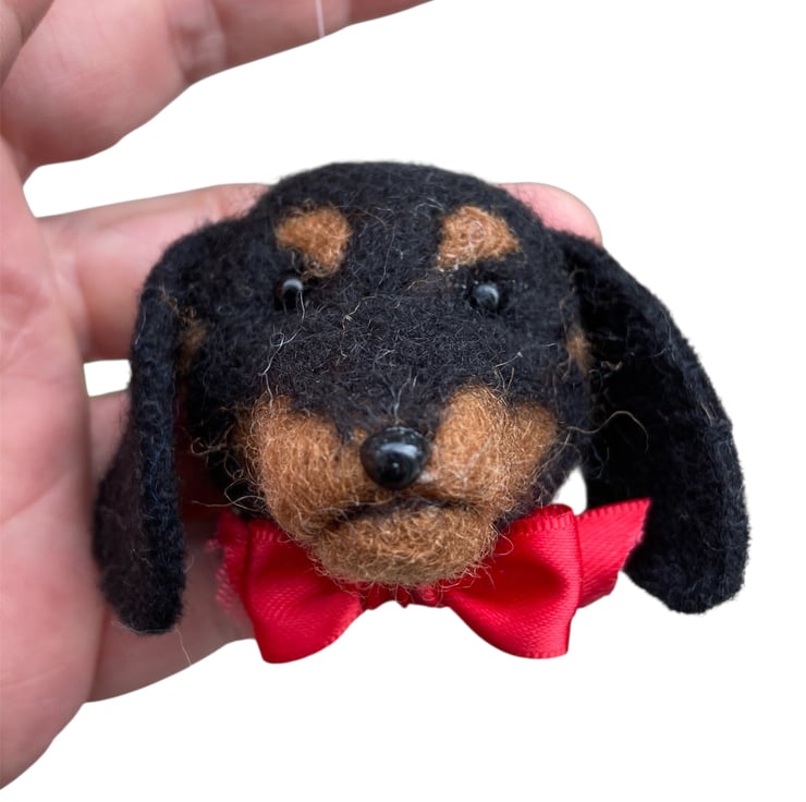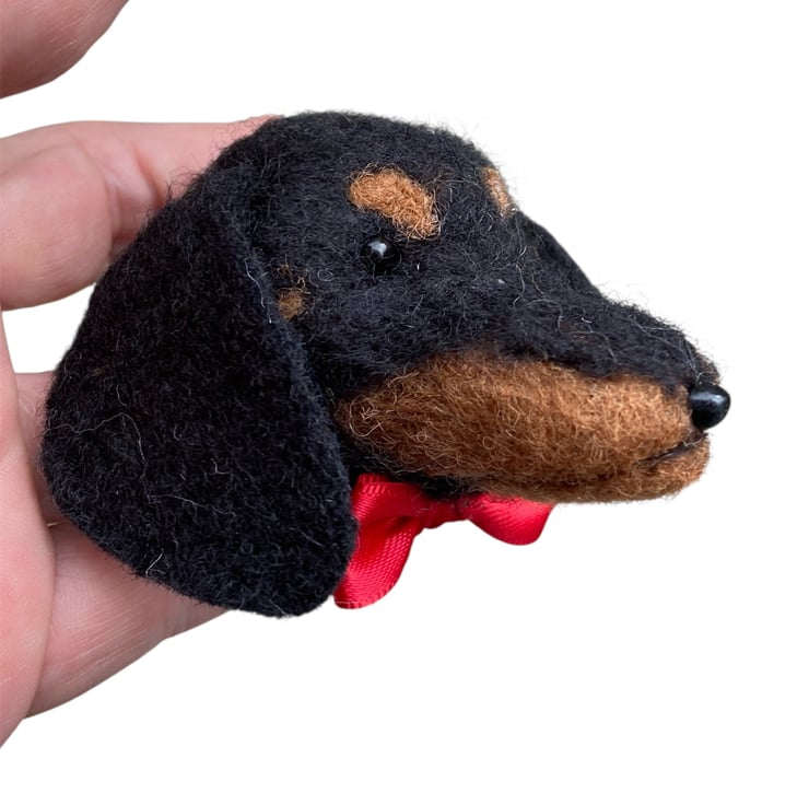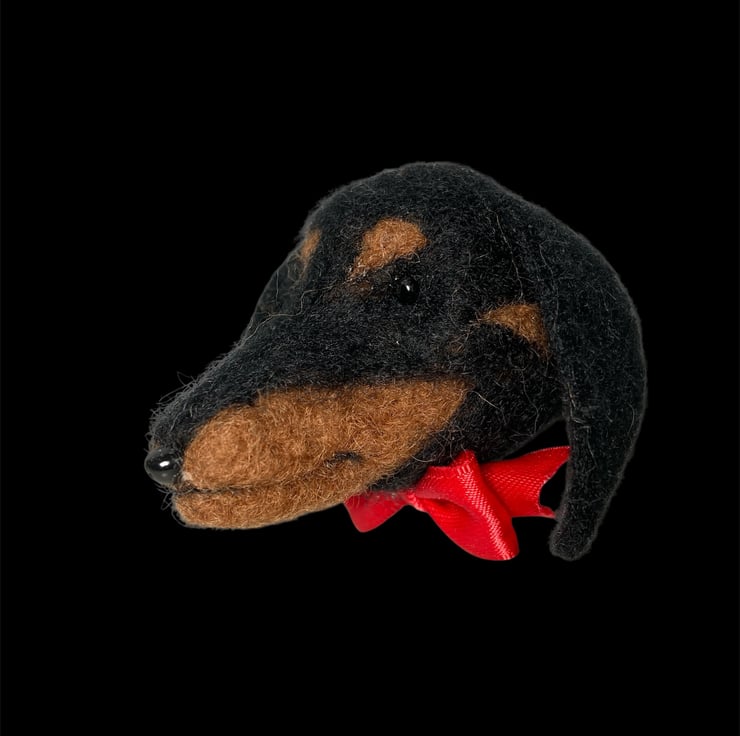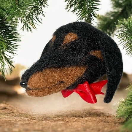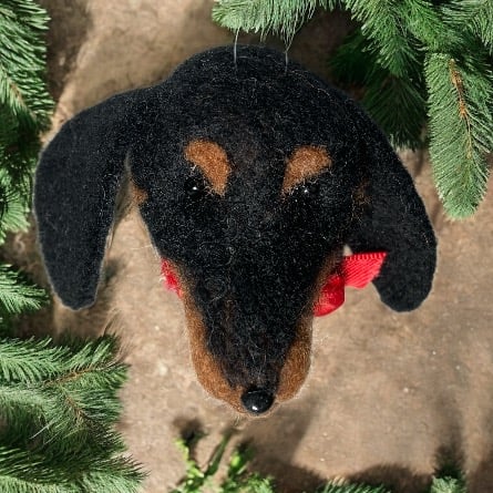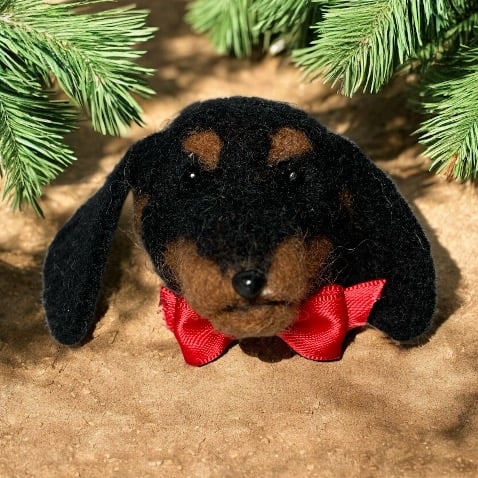 An adorable needle felted dachshund head bauble to hang from your tree this christmas. This dachshund bauble is formed using woollen fibres needle felted and sculpted into shape using a barbed felting needle. Characteristic markings and long ears have been added along with a black plastic nose and glass eyes. A red ribbon has been added at his neck and a clear nylon thread has been added to enable the dog to be hung easily from the tree.