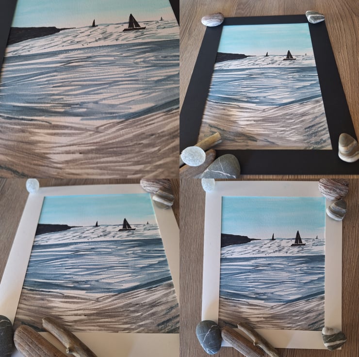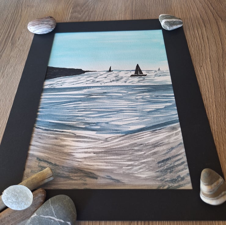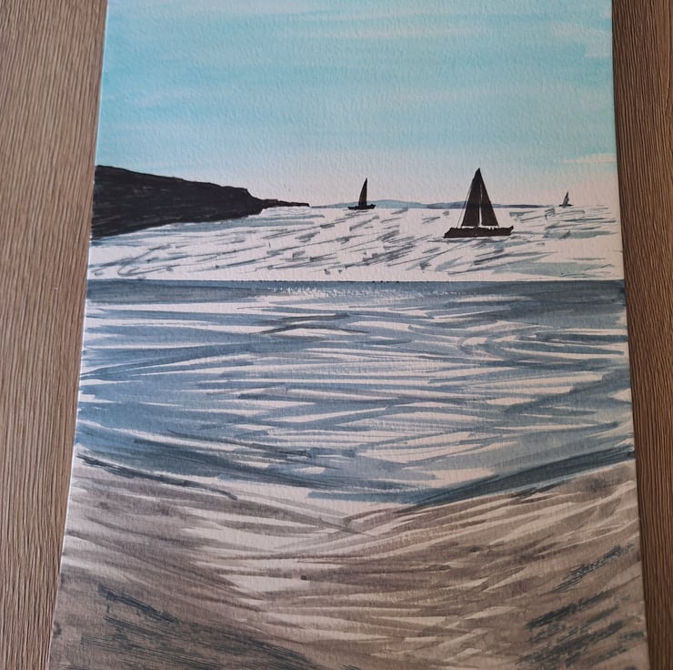 A4 watercolour painting depicting boats out sea light bright serene. Boarders display purposes only .