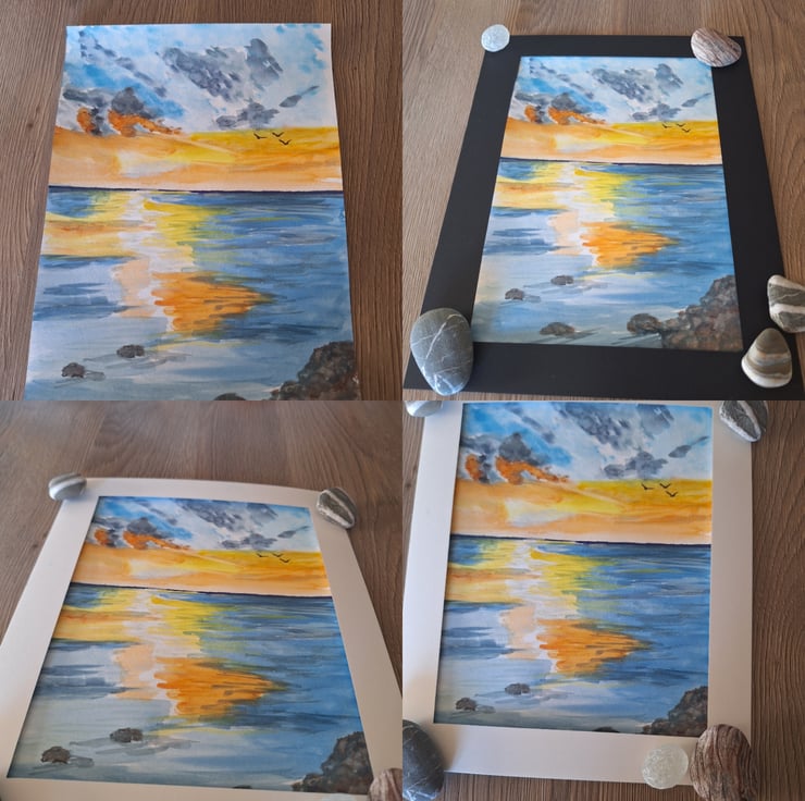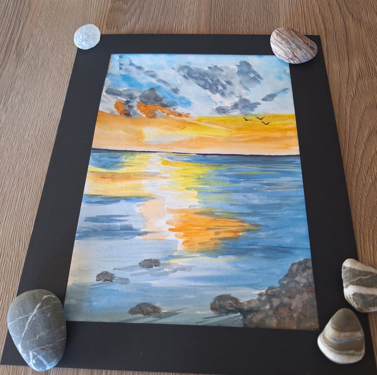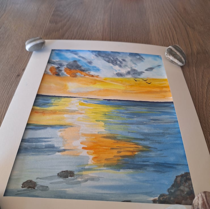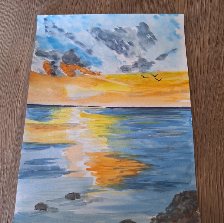 A4 watercolour painting depicting sun sea cast bright and colourful.