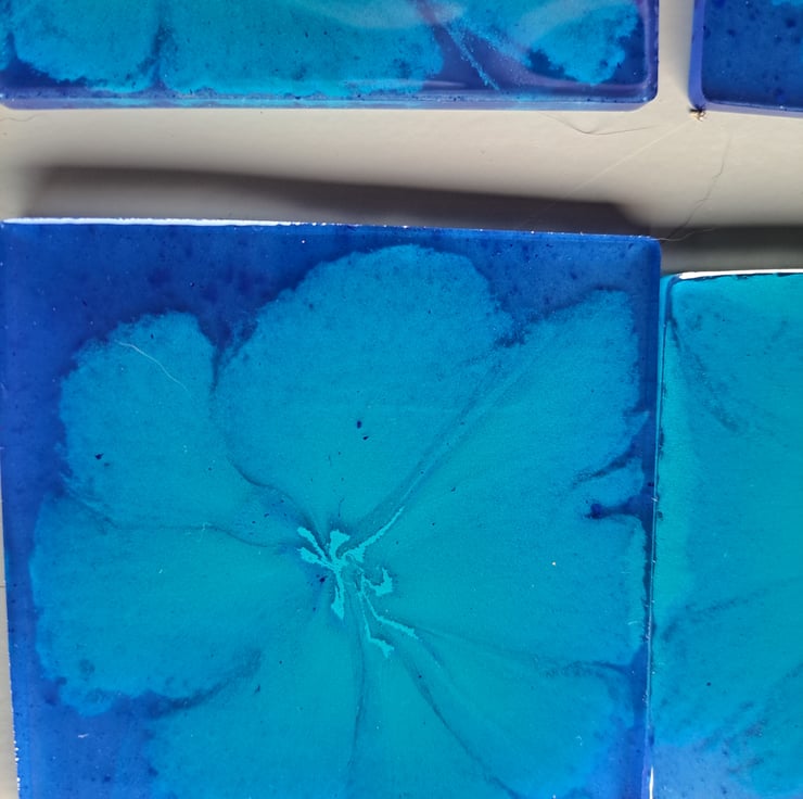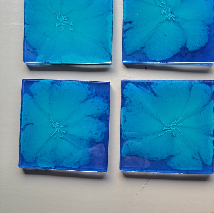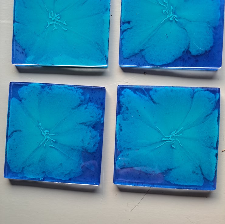 Set of 4 Blue Resin Coasters – "Sea Blossom"