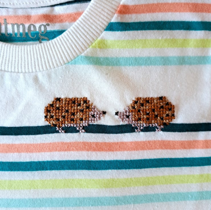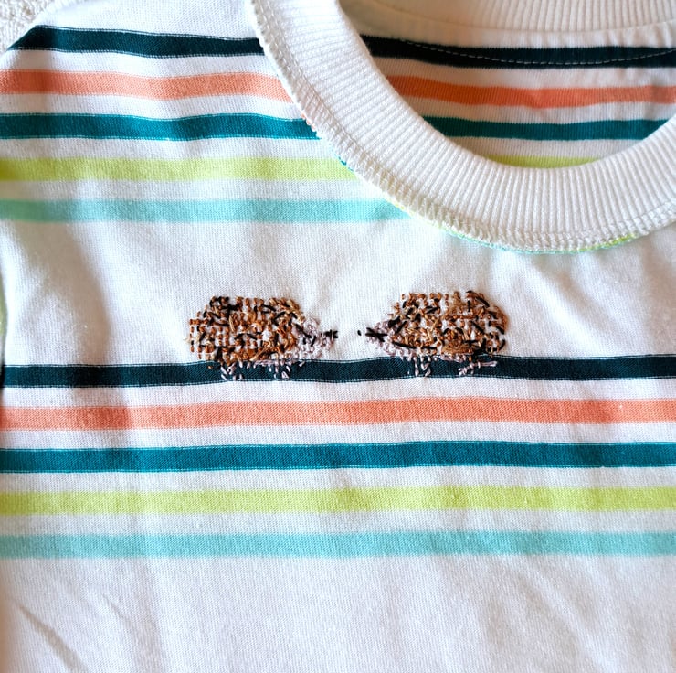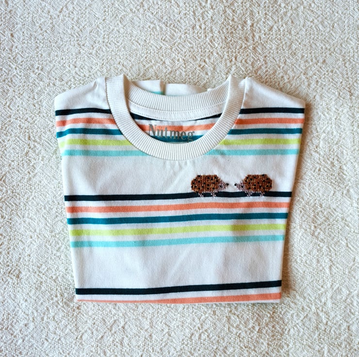 I have stitched two hedgehogs, nose to nose, on the left front of this lovely cream T-shirt, with narrow stripes of dark green, orange, kingfisher, pale greenish yellow and light turquoise. As I never use a permanent backing fabric when hand embroidering kids' clothing, there is nothing inside the shirt to irritate your child's skin. It has a round neck and short sleeves, and as it is all cotton can be machine washed