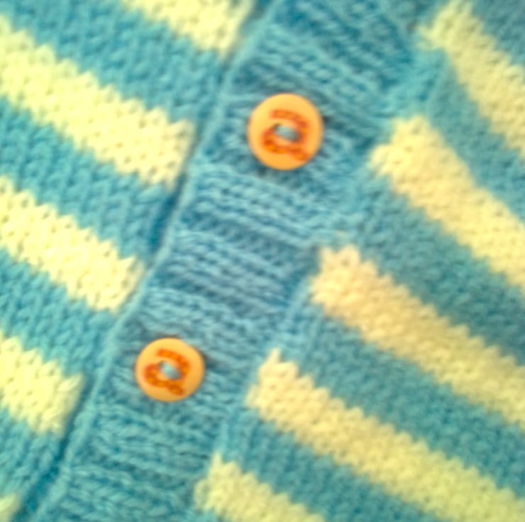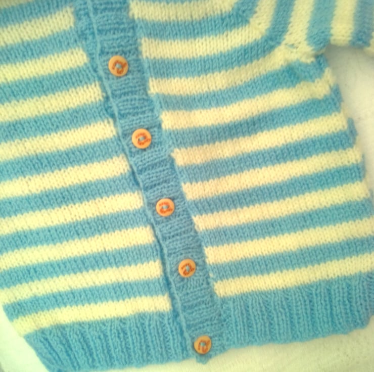 This practical and warm hand knitted jacket with a hood made using a soft acrylic double knitting yarn. It is fastened with 6 wooden initial buttons.. It would make an ideal gift for a baby shower, for a new baby or for you own little ones to keep them snug and cosy this winter.