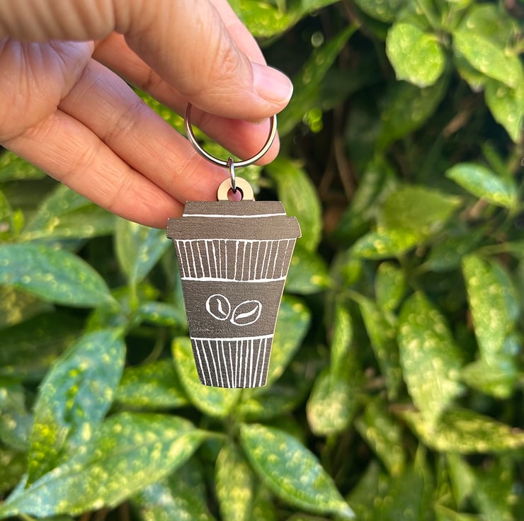 Fantastic for the coffee lover in your life! Perfect for birthday, christmas, anniversary or just for you to keep your keys. Mounted onto a little card which is ideal for giving as a gift. The design is taken from my own linoprint and printed in black onto a maple veneer, showing the grain of the wood for a more natural looking finish.