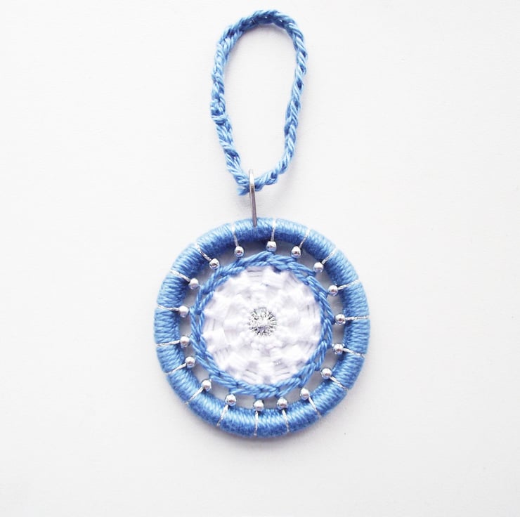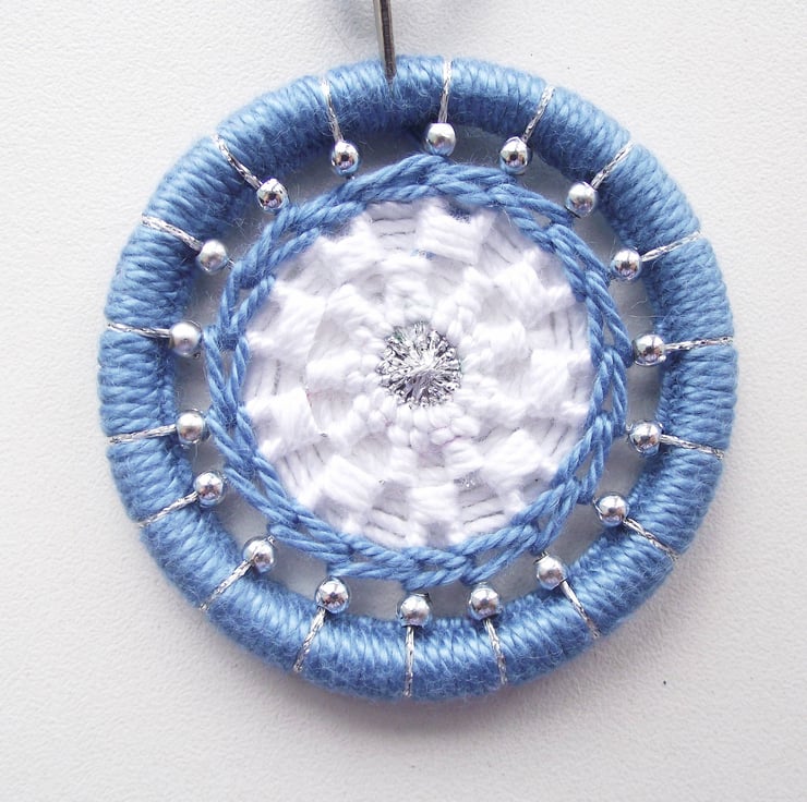 I made this exclusive Christmas decoration by making a large Dorset button in blue, white and silver and silver beads. I used blue and white cotton thread worked over a repurposed curtain ring. The overall diameter is 5.5cm.