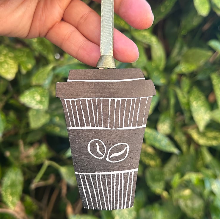 'But First Coffee' hanging decoration finished with a green satin ribbon, a great gift for the coffee lover in your life or a fabulous addition to your own decor. The design is taken from my own linoprint and printed in black on to a maple veneer, showing the grain of the wood for a more natural looking finish.