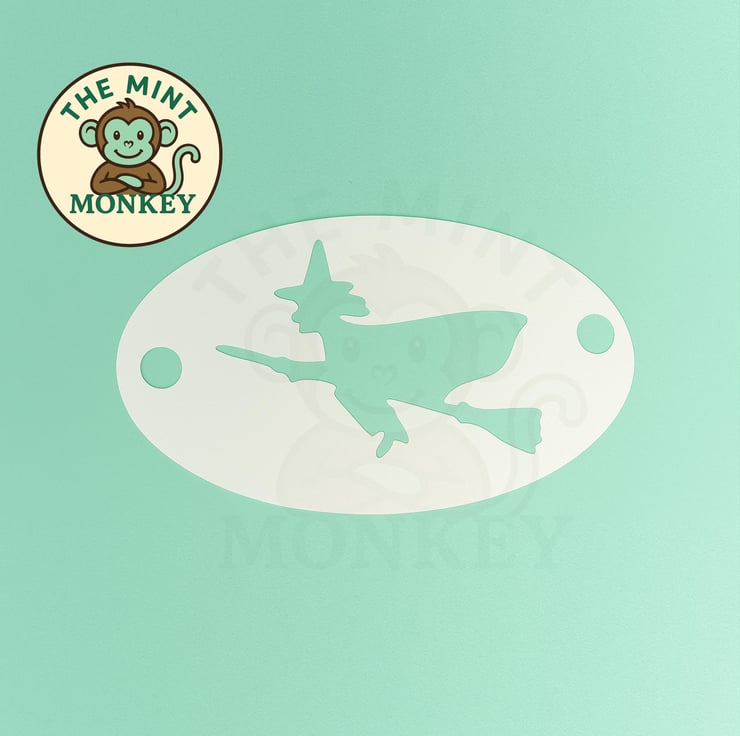 The Witch on a broom Face Paint Stencil is a reusable face paint, glitter tattoo or cake stencil template, perfect for kids at parties or a cake baker.