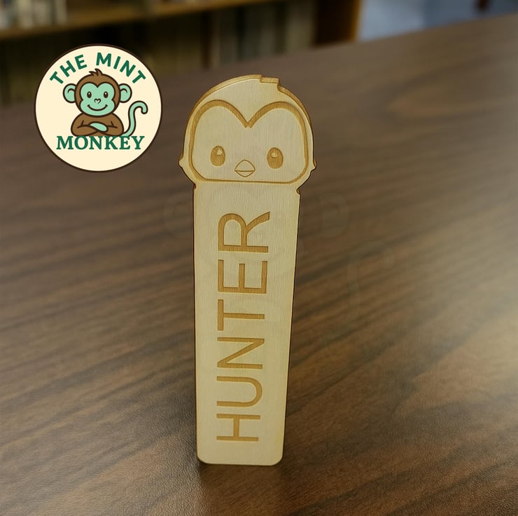Mark your place in style with this personalised wooden bookmark featuring a charming Penguin head design. Each bookmark is crafted from 3mm birch wood and engraved with the name of your choice, making it a thoughtful and practical gift for any bookworm & penguin lover.
