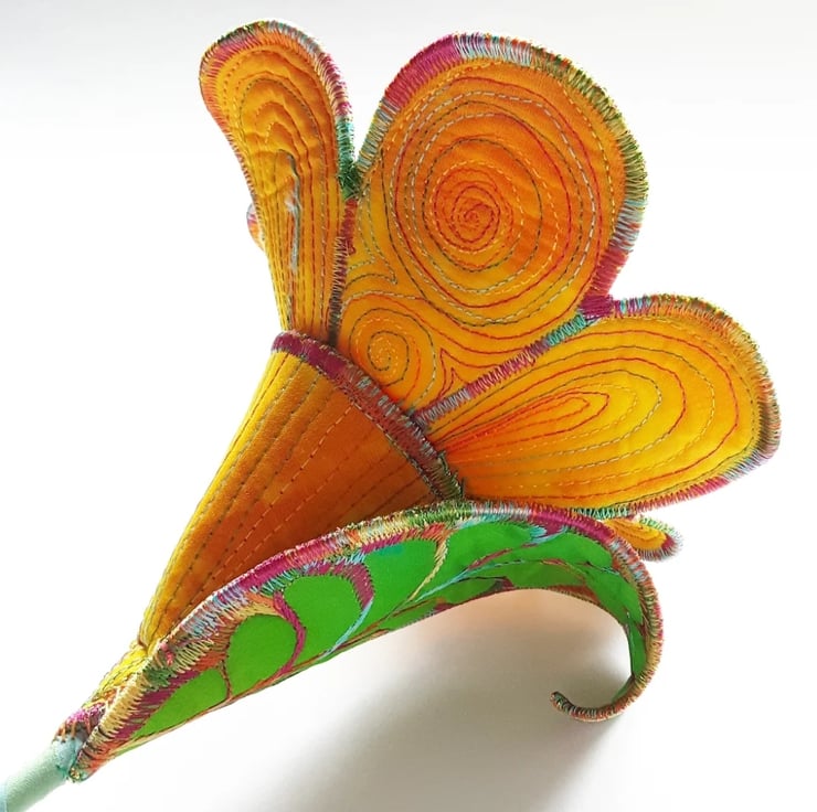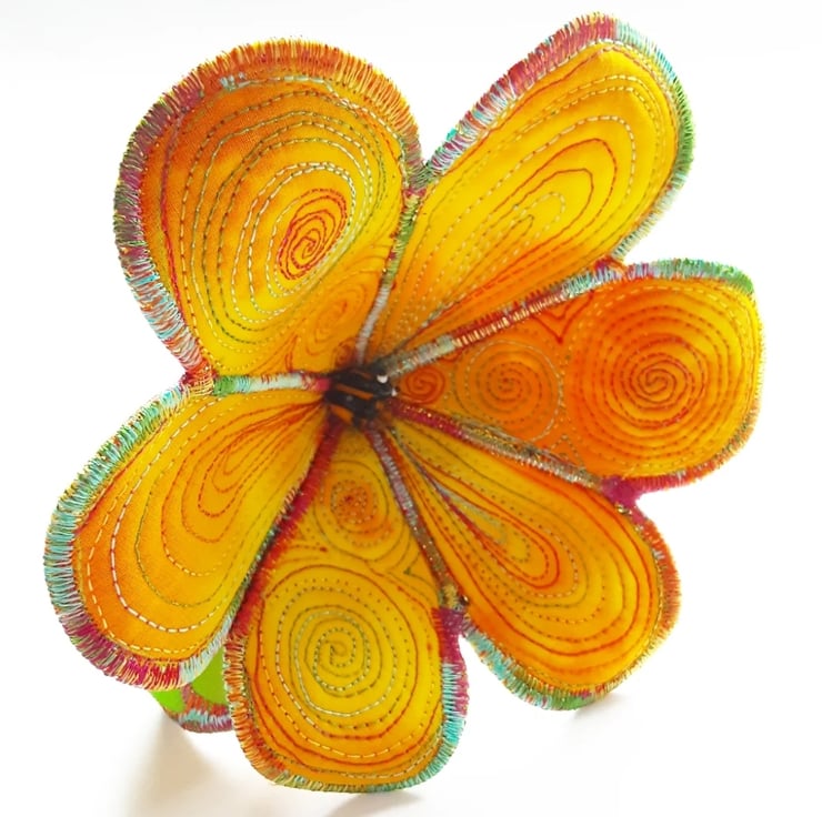 Made from layers of fabric including hand dyed Egyptian cotton and silk fabrics using the free machine embroidery style of sewing