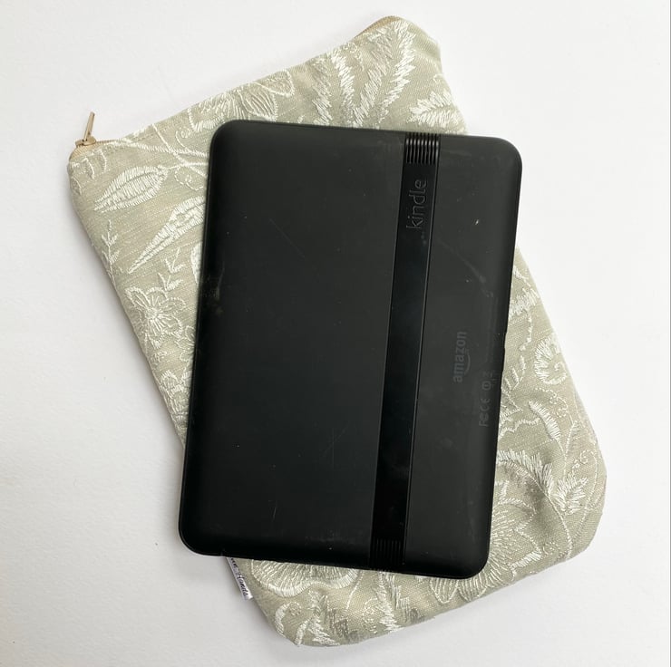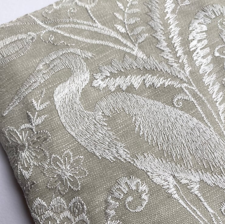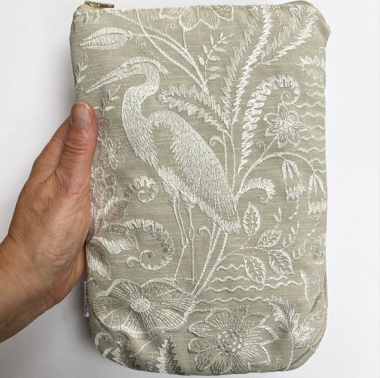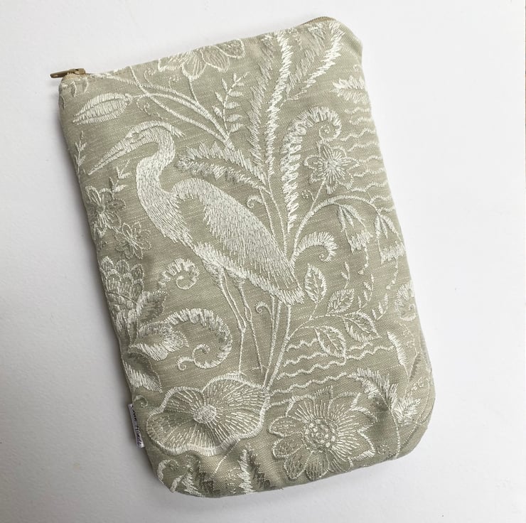 This up-cycled fabric zip bag is decorated with beautiful embroidered flowers and a heron. It’s padded and lined inside with a matching coloured zip. The embroidery is on the front and back. It’s perfect for helping protect your kindle, small tablet or phone.