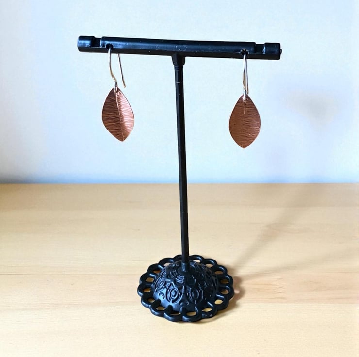 Perfect for your Autumn outfits, or to wear at any time of year, these leaf earrings are available in copper or sterling silver. They are cut and shaped from the metal then hammered to create texture. They hang from handmade sterling silver earwires. Each leaf measures approximately 2cm x 1cm. Overall drop is approximately 3cm.