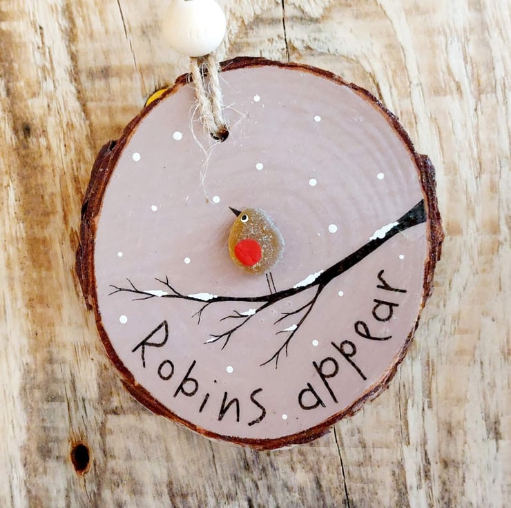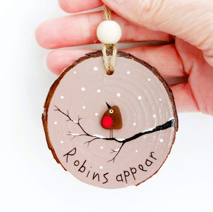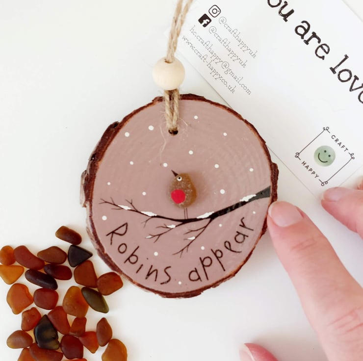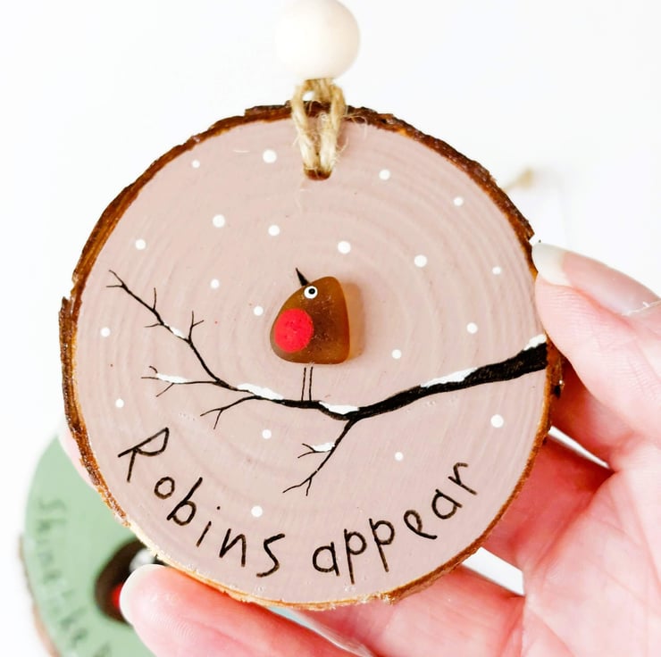 Eash robin has been individually crafted using perfectly tumbled and frosted sea glass from my collection, carefully selected for shape and colour, before being delicately hand painted. The additional details and the text has been individually drawn and the whole design is varnished and complemented with natural jute so it's ready to hang on your tree.