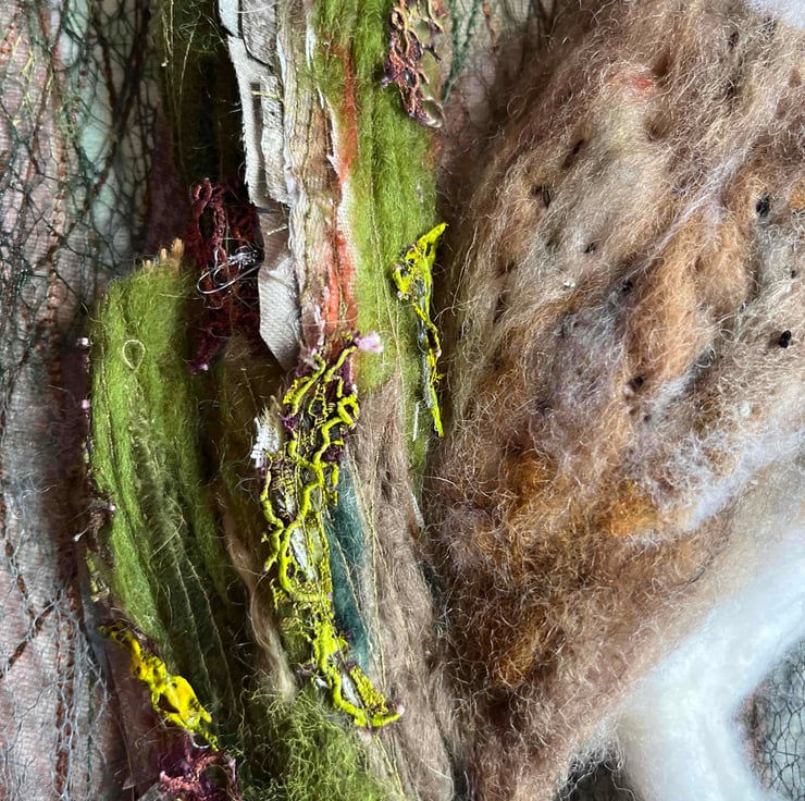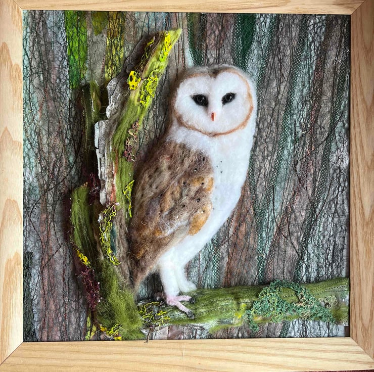 Needle felted and mixed media picture . In a pre-loved wood frame without glass , measuring 14 inches square.