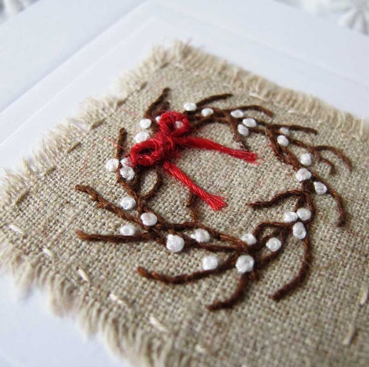 HAND EMBROIDERED CHRISTMAS CARD WINTER WREATH