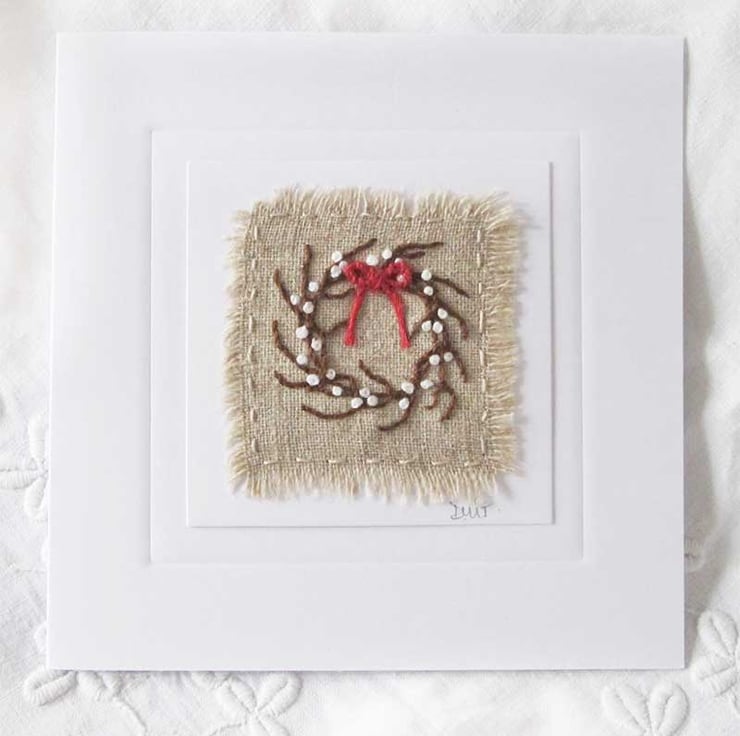 This beautiful card has been embroidered by hand onto a piece of woven linen style fabric. The design is of a Christmas wreath of twigs with white berries and a red bow - perfect for a special Christmas card. It has been mounted on a card base and is surrounded by an embossed square. The card has been left blank for your own message.