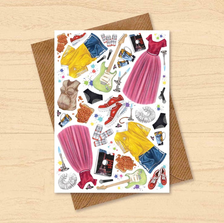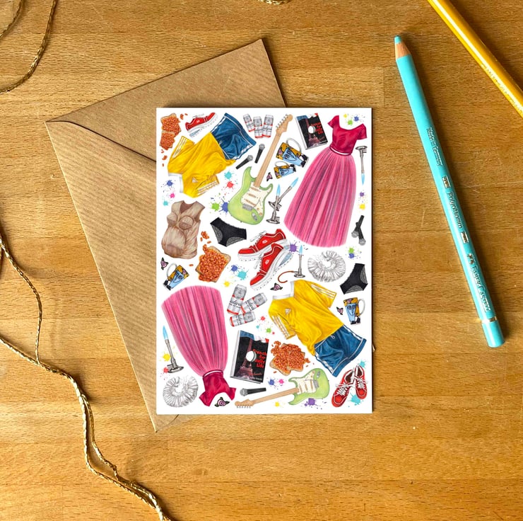 Inspired by the unforgettable 90s teen classic 10 Things I Hate About You, this hand-illustrated card is a nostalgic love letter to the era of mixtapes, prom nights, and rebellious poetry. Each design element captures a memorable moment or character detail – from Kat Stratford’s iconic guitar to Mandella’s Shakespearean ruff – making it a perfect keepsake for rom-com lovers, millennials, or anyone who still swoons over Patrick Verona’s serenade.
