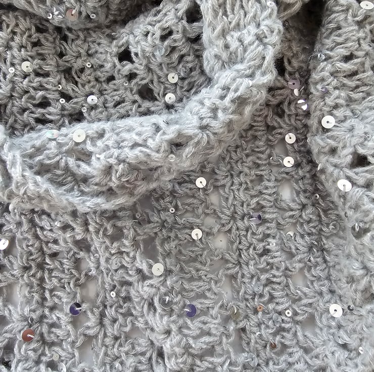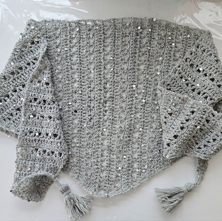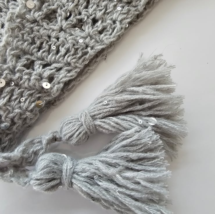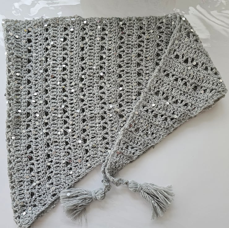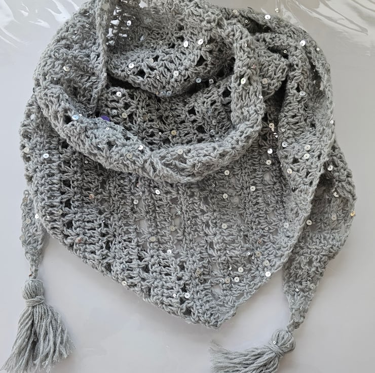 This listing is for a modern triangle scarf which has been hand crocheted in a gorgeous light grey yarn which has fab silver sequins dotted all over. It even has tassels at each end for extra cuteness.