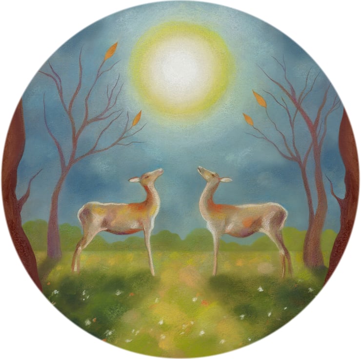 I used chalk pastels and pencils to create this ethereal drawing of two female deer basking in the glow of the light. The mirroring of the two deer and the two circles contributes to the peaceful feeling of this drawing. It was inspired by my walks in Bushy Park (one of London's Royal Parks), in which the deer roam freely. One time I came across a female deer who was looking up in this way (she was actually munching on a tree branch!) and my photograph of her was the starting point for this piece.