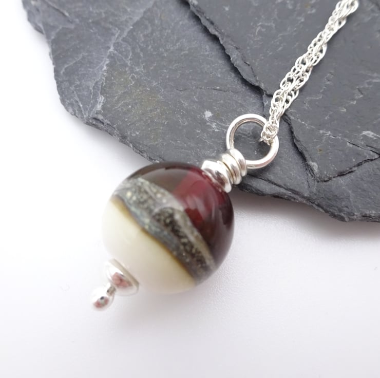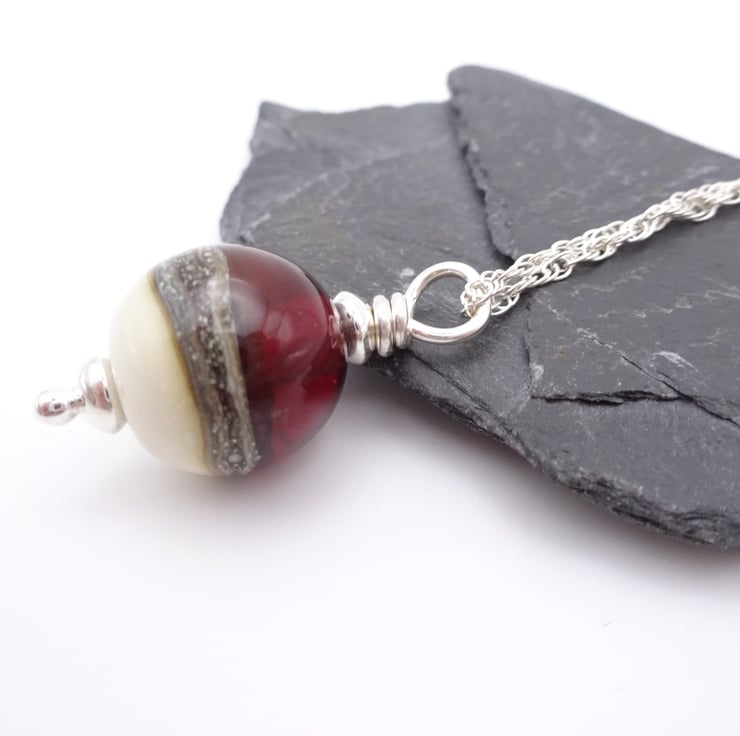 A sterling silver chain strung with a handmade lampwork glass pendant bead. The bead has been made with ivory and dark red glass and shaped into a sphere.