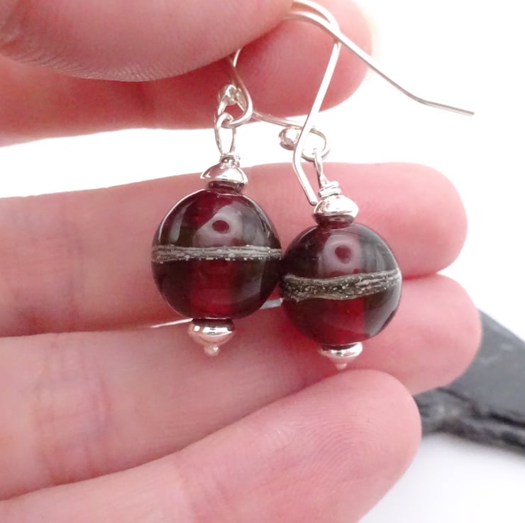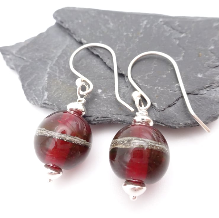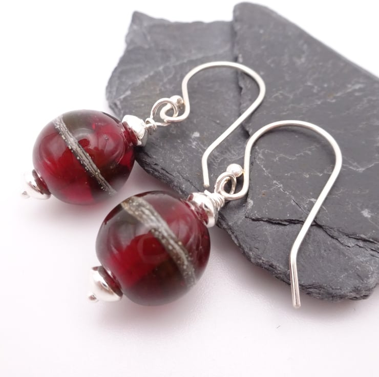 A pair of sterling silver earrings which feature dark red handmade lampwork glass beads which have been wrapped with a band of silvered glass.