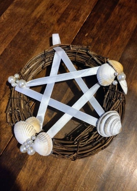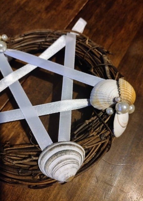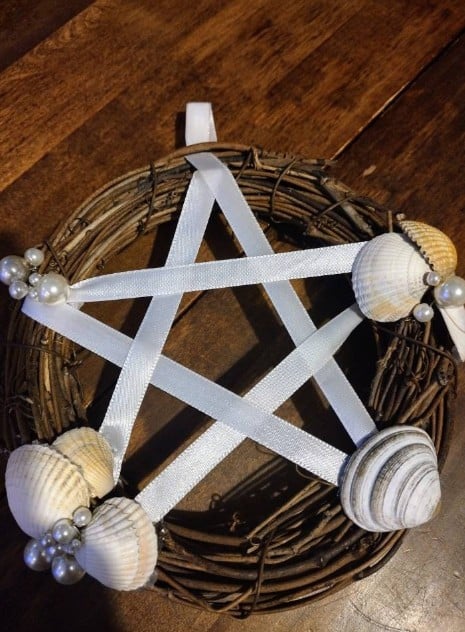 Made from sea shells with glass pearls, wired into a wreath with white ribbon pentacle.