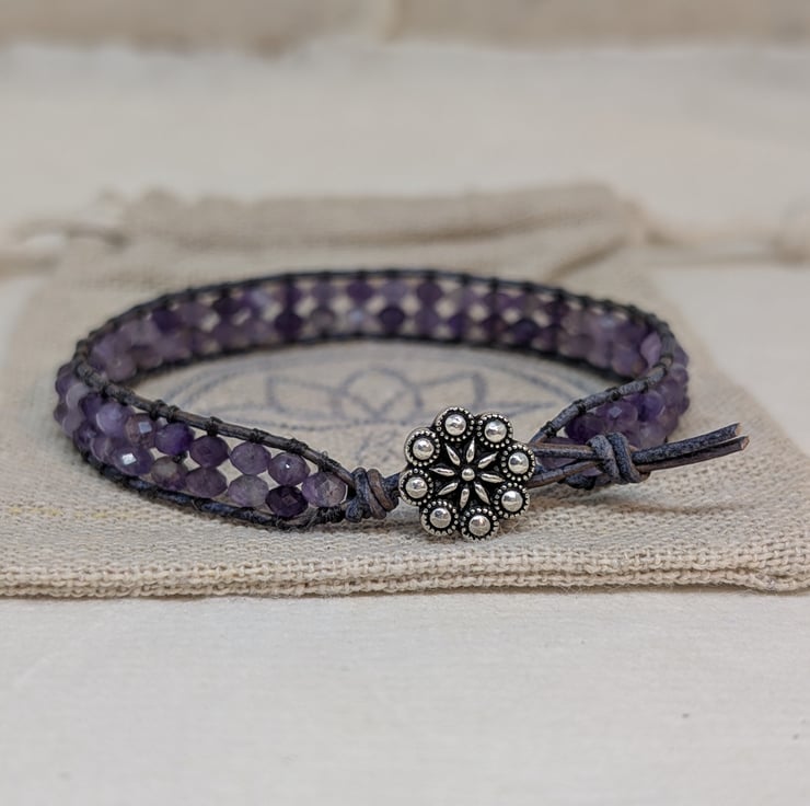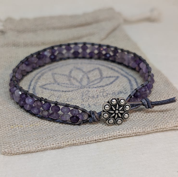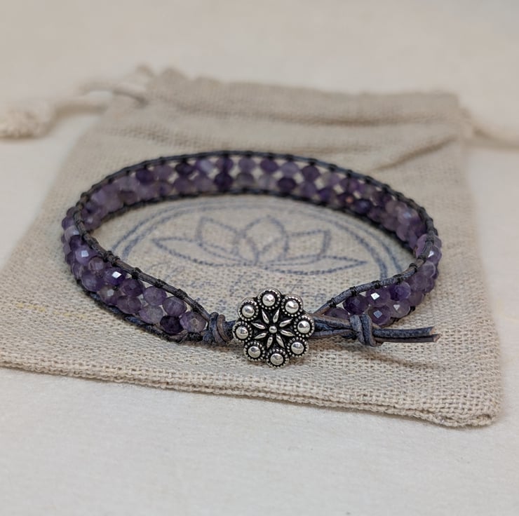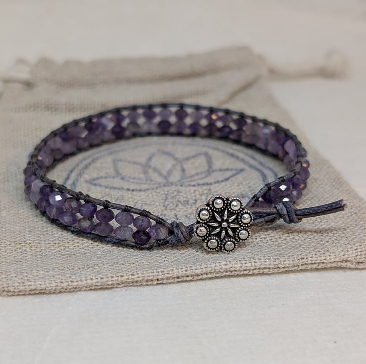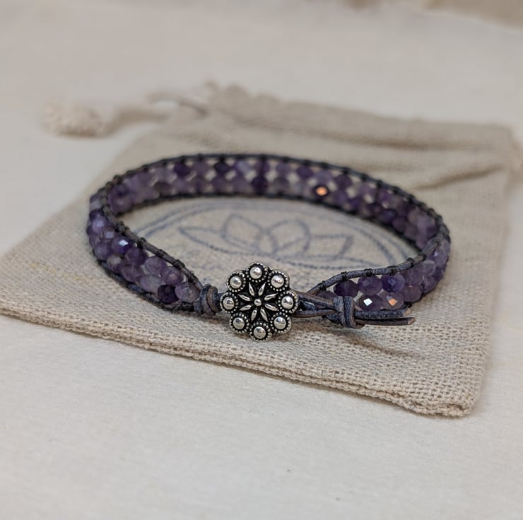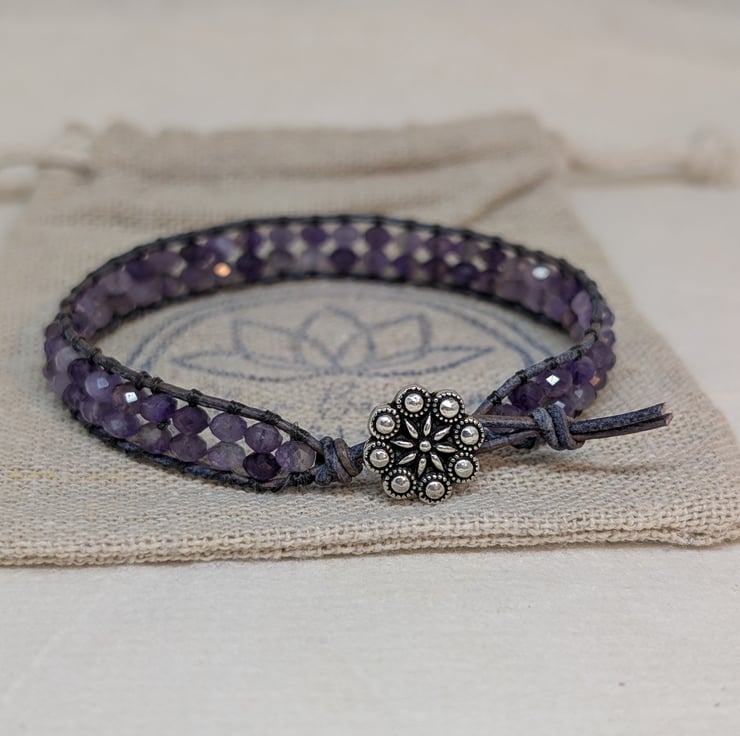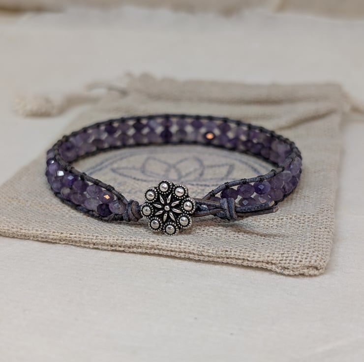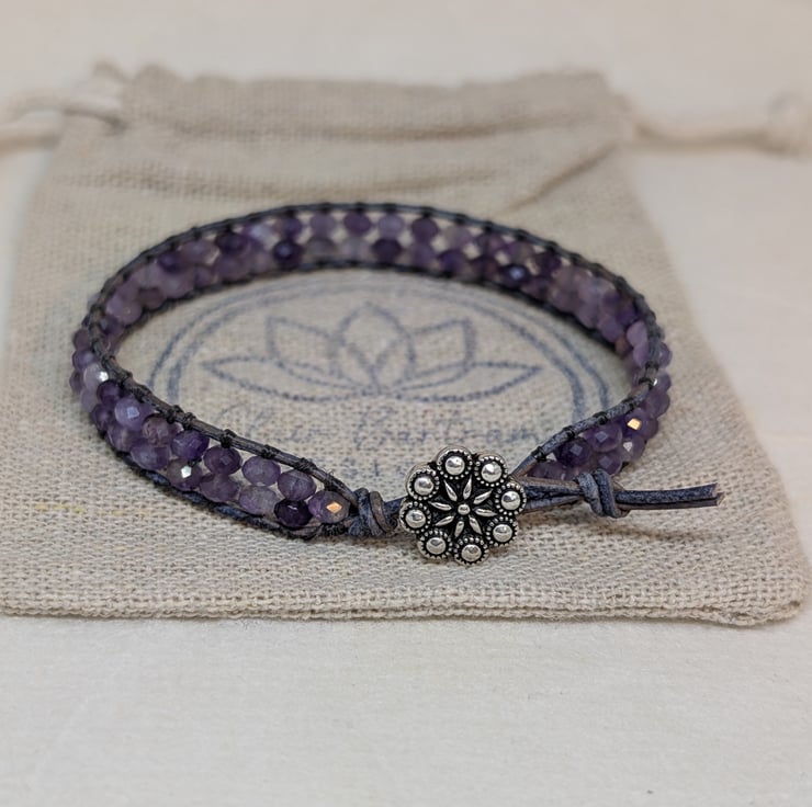 This handmade bracelet features tiny faceted amethyst rondelle beads, carefully stitched between strands of soft leather cord. The gemstones sparkle beautifully in the light, while the bracelet fastens neatly with a decorative silver-coloured button. It measures 7 inches, making it a comfortable fit for most wrists.