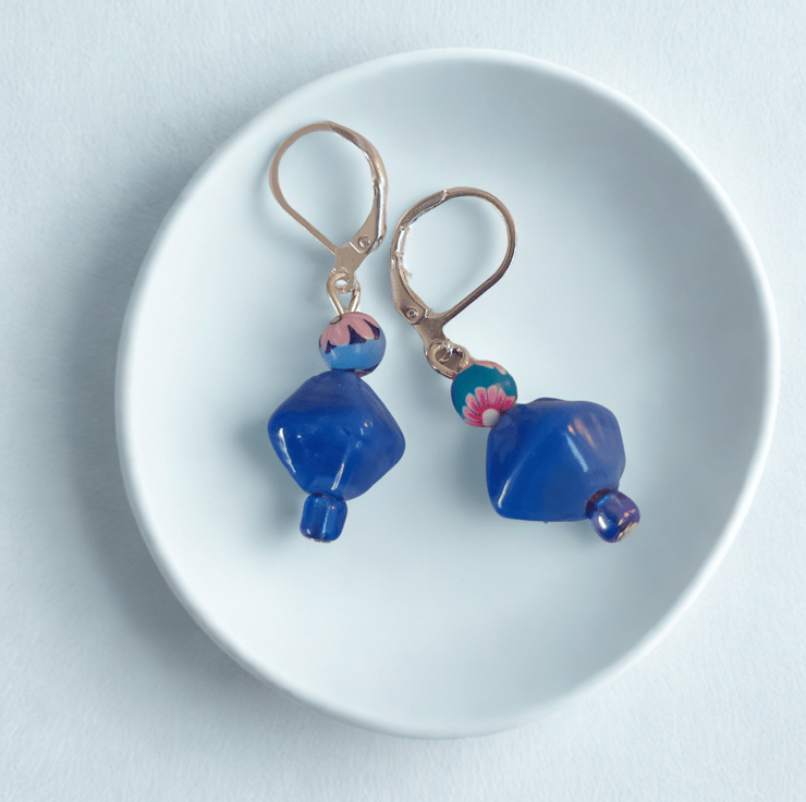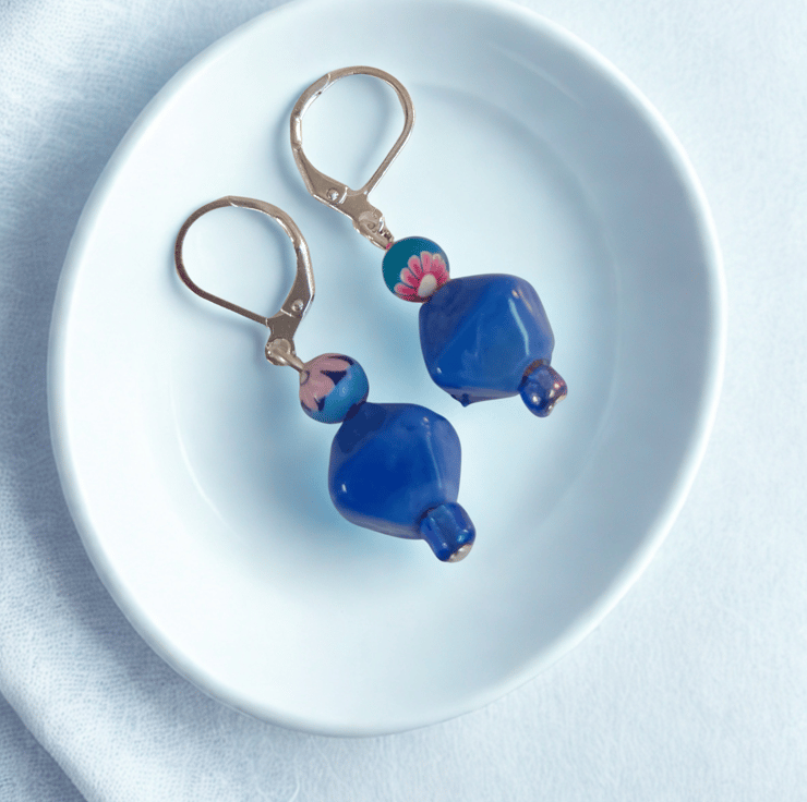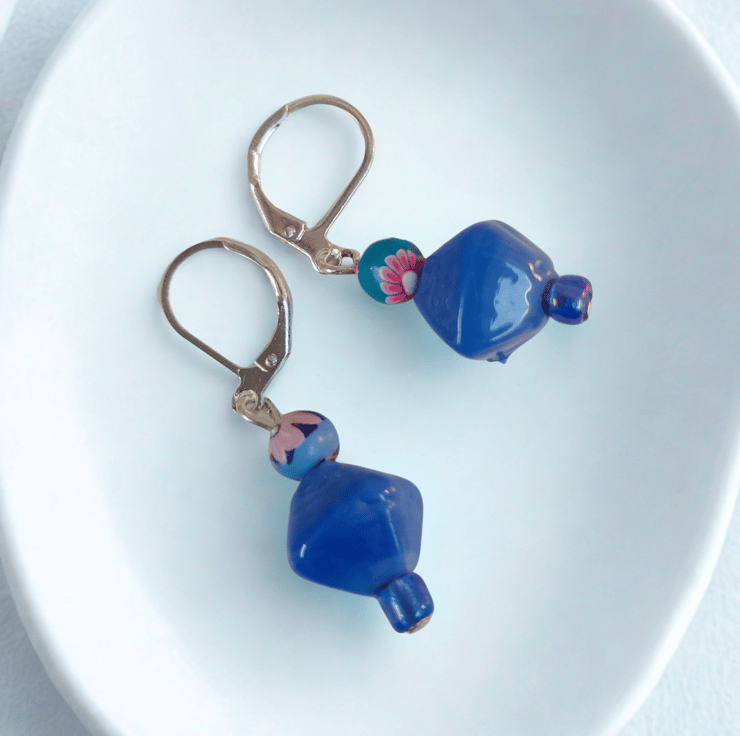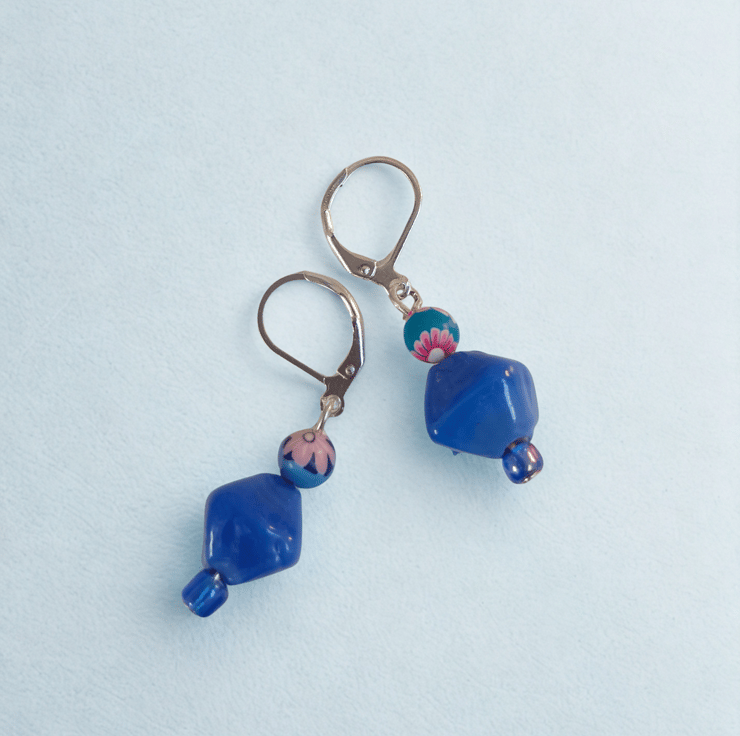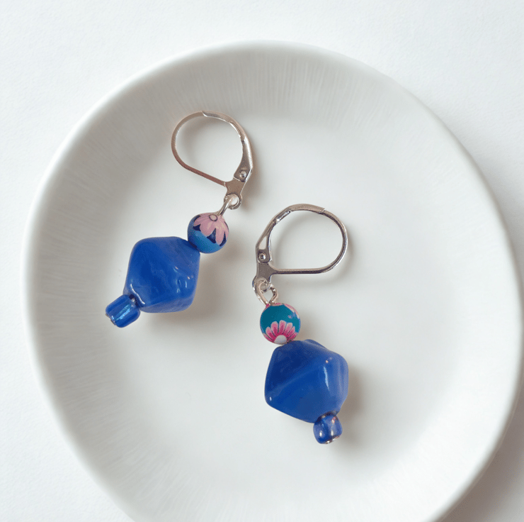 Super opaque true blue ceramic beads with little glass beads and a small funky polymer clay bead in blue and pink.on a nickel free 925 silver lever back hooks.