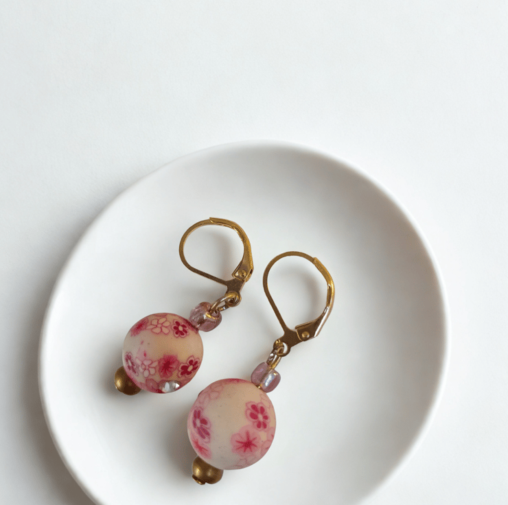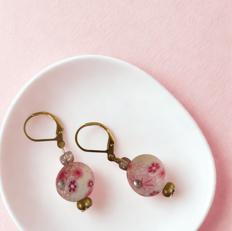 Polymer clay beads with a pink floral pattern with tiny sparkly diamante dots embedded in the clay. These super cute polymer clay beads are blended with glass beads in pink and antique gold. On 24 carat gold plated lever back hooks.