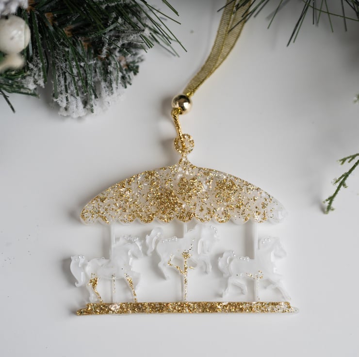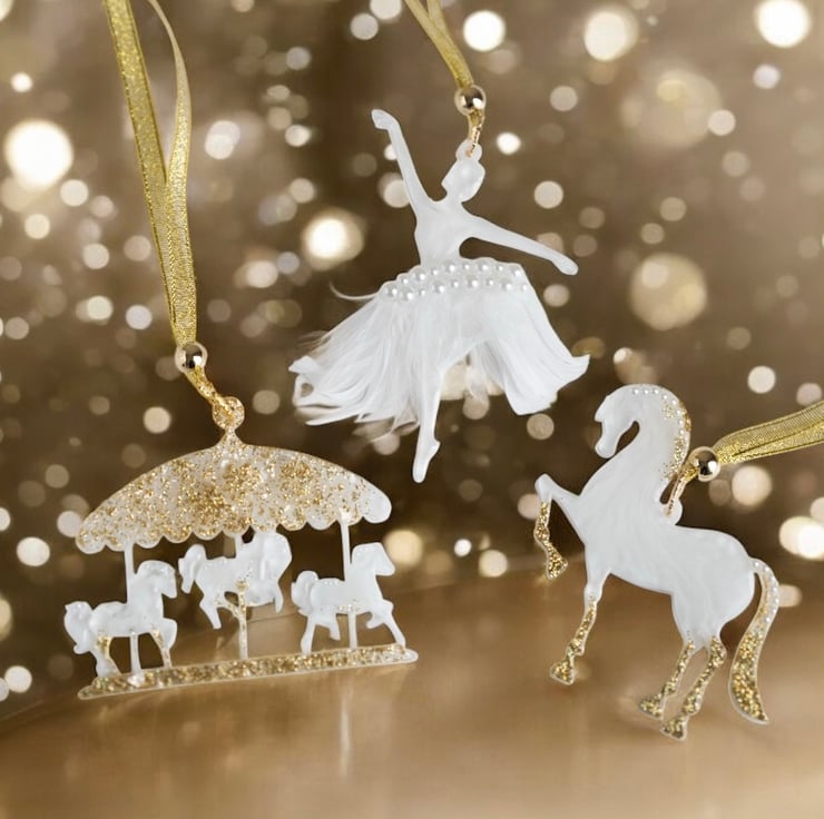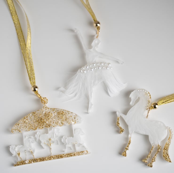 Bring a little magic to your Christmas tree with these handcrafted resin ornaments. Inspired by the grace of ballet and the charm of a vintage carousel, each piece is carefully made in white and gold tones that catch the light beautifully.