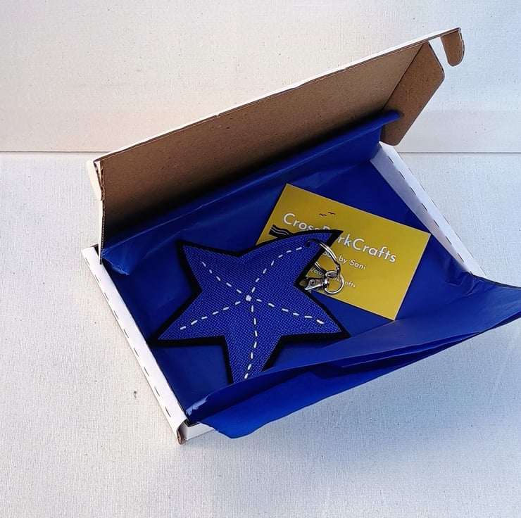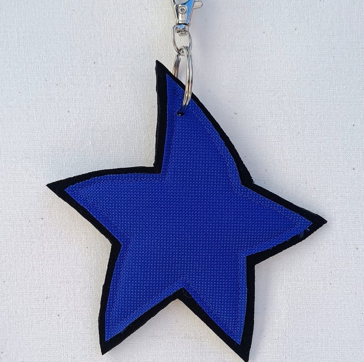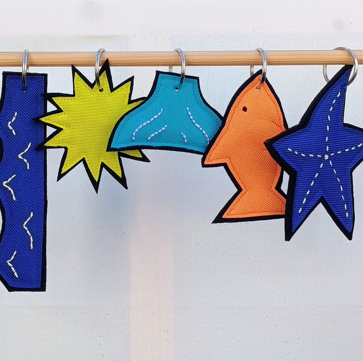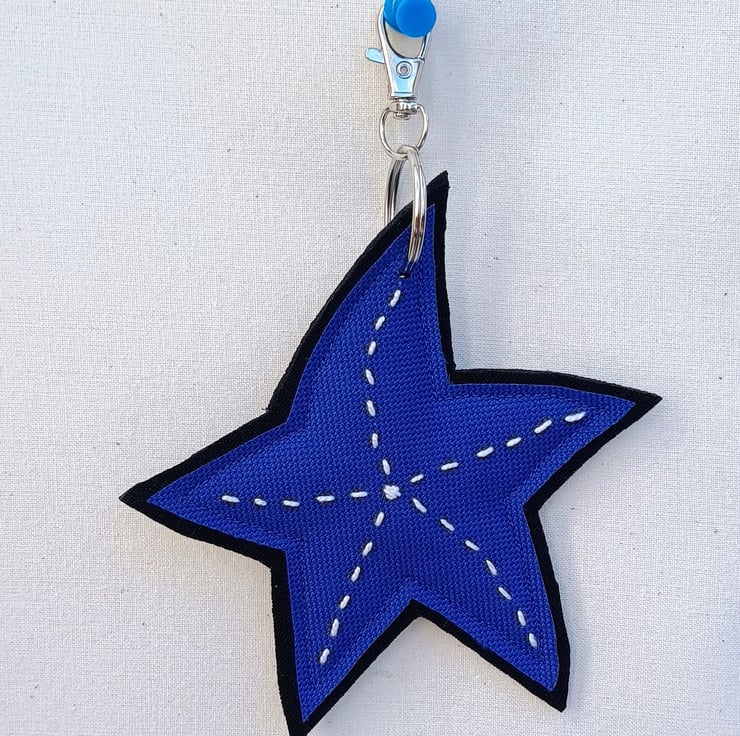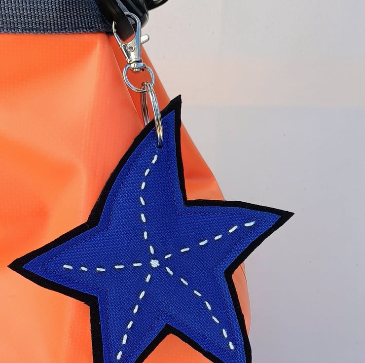 A fun, bright blue starfish keyring or bag charm. Handmade using cordura fabric and neoprene with embroidered stitch detailing, finished with a metal swivel lobster clasp.