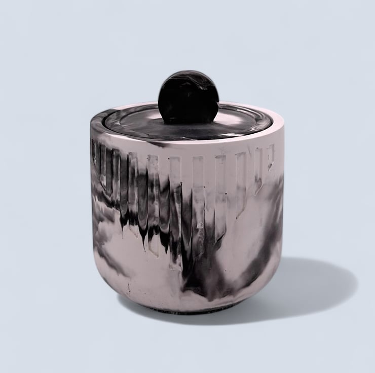 For me, this piece is about celebrating the elegance of natural stone while reimagining it in a practical, decorative form. The round shape and simple groove detailing let the marbling take centre stage, while the disk-shaped lid adds character. Whether it’s holding jewellery, keepsakes, or just sitting on display, it brings a calm, modern accent into any room.
