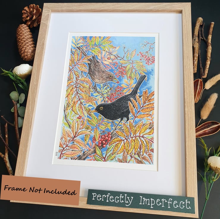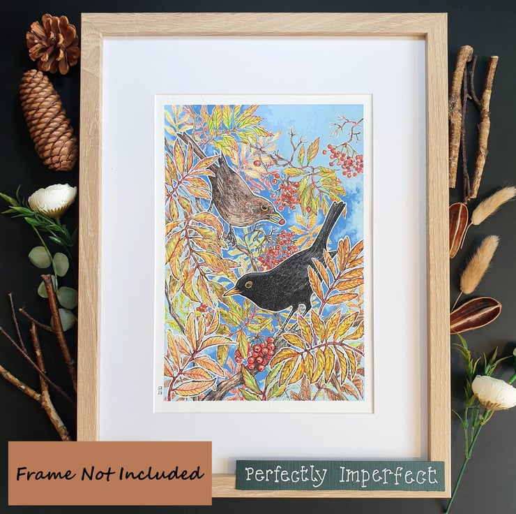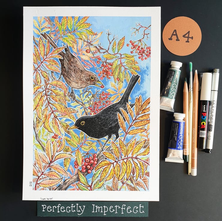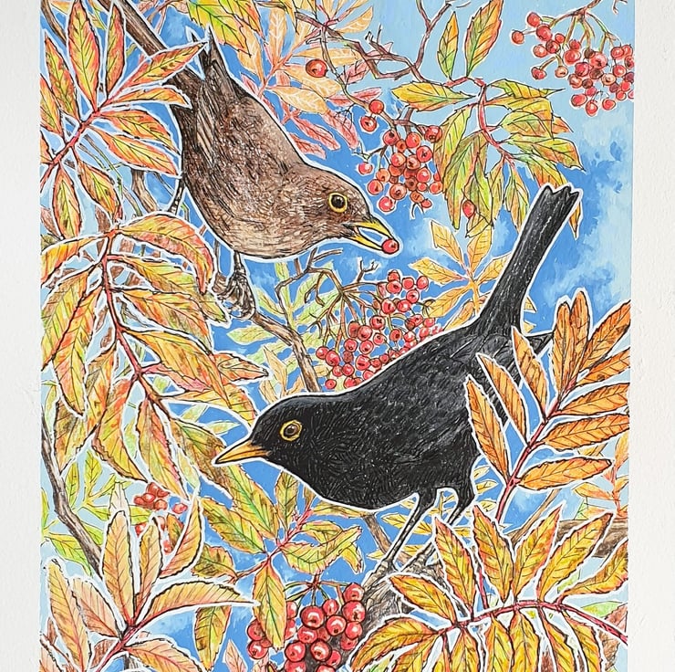 A drawing using a mix of media on A4 acid free paper. The drawing shows two blackbirds, one male and one female among autumn rowan berries and leaves with a blue background. The drawing has an illustrative feel with white outline on the main subjects.