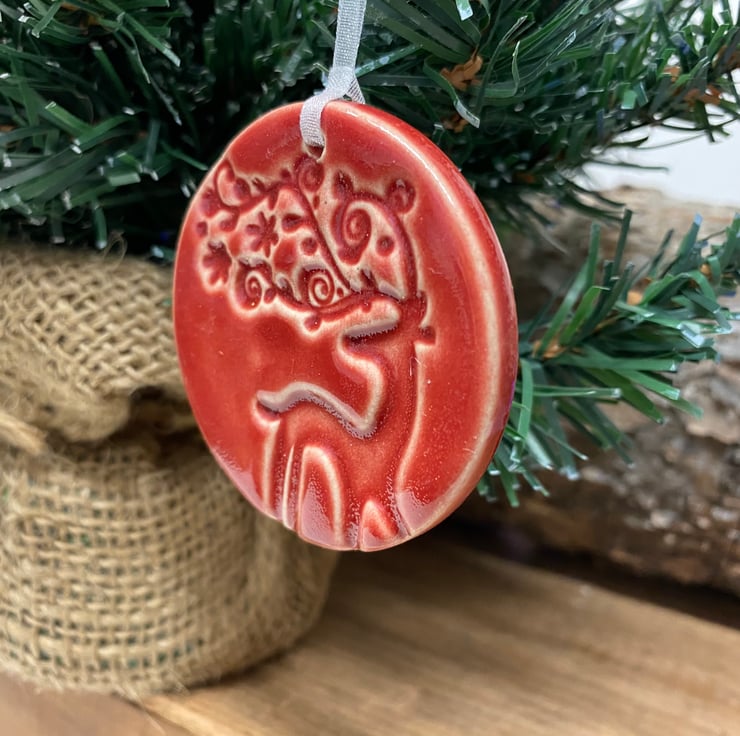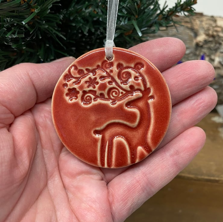 This little pottery Christmas decoration is made from white earthenware clay and decorated with a stag design. It measures 5.5cm diameter and hangs from a cream organza ribbon. It has been fired twice and finished with a rich, glossy glaze.