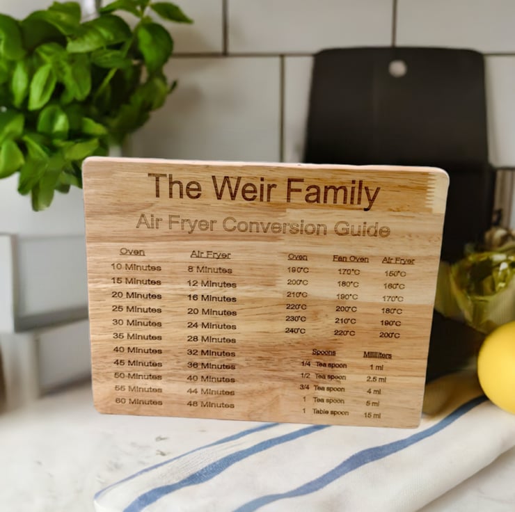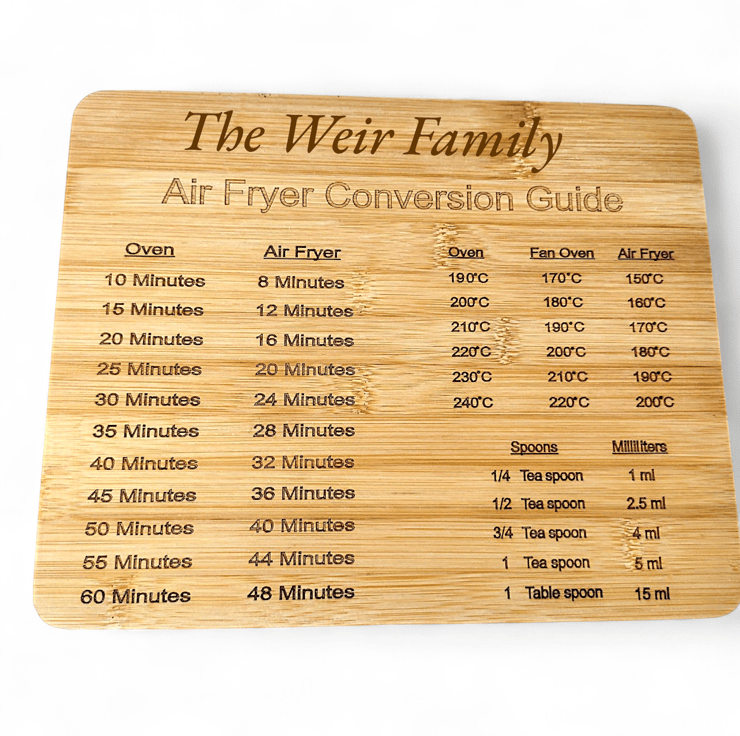Whether you're air frying, oven roasting, or chopping ingredients, this 300mm x 245mm x 15mm board is your go-to guide — beautifully laser engraved for clarity and durability. It’s more than just a kitchen tool; it’s a thoughtful housewarming present or gift for the special mum who loves to cook.