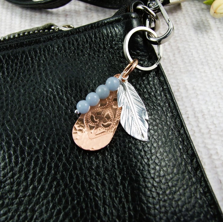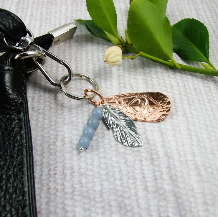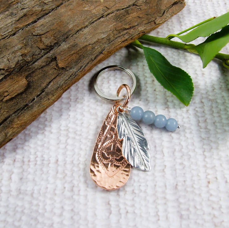 Keyring, sterling silver feather with a copper tag patterned with floral design and angelite gemstones. Would make a lovely keepsake.