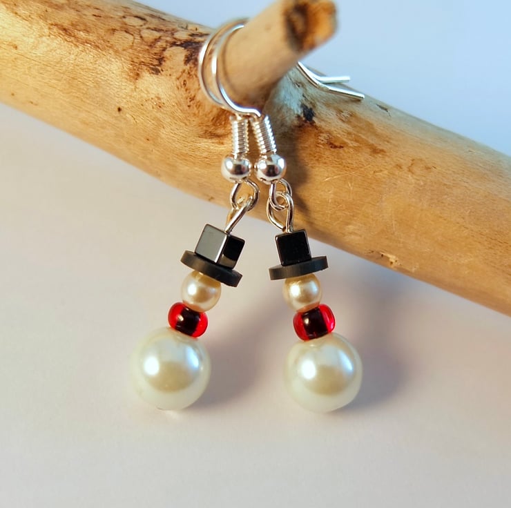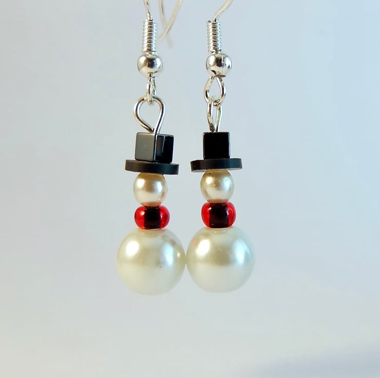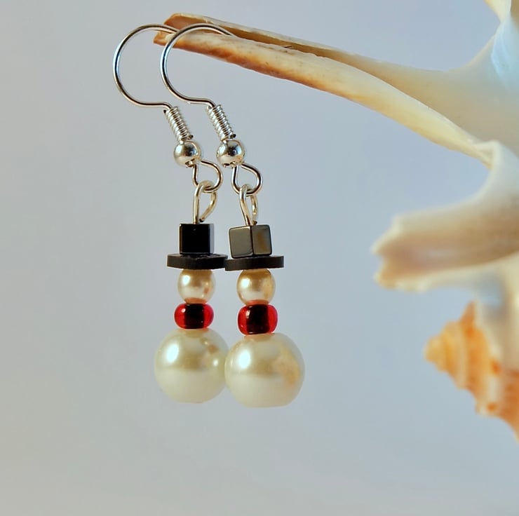 Sweet little festive snowmen earrings made from glass pearls for the body and head, with a tiny red glass bead for a scarf and a hat made from a hematite cube and polymer clay disc.