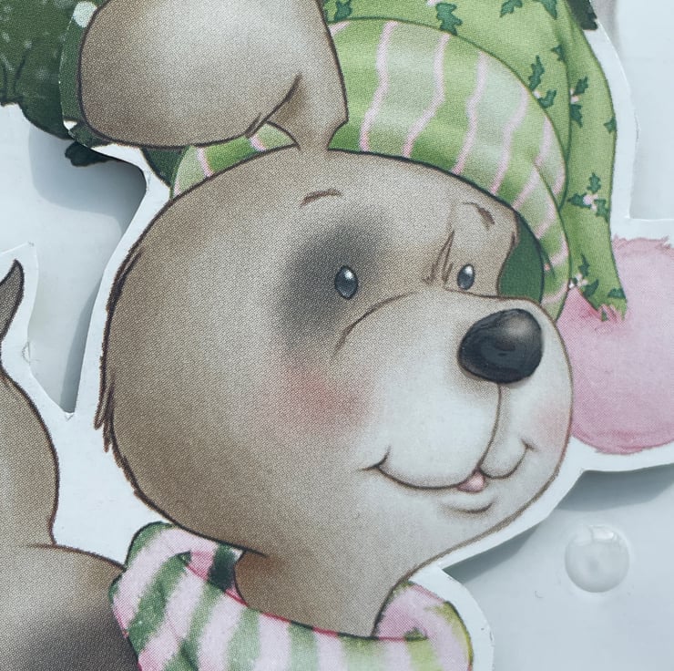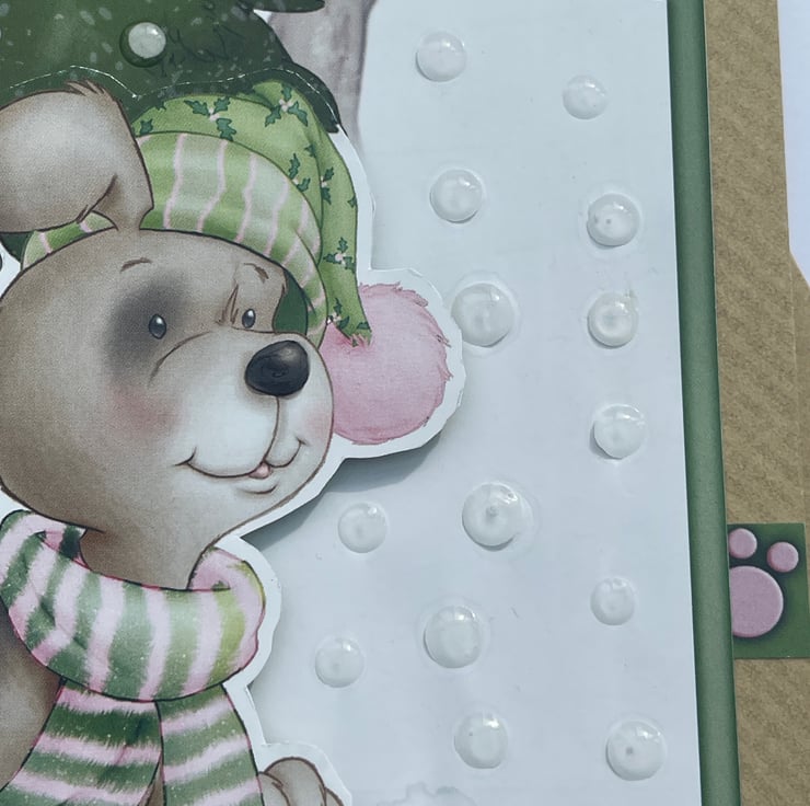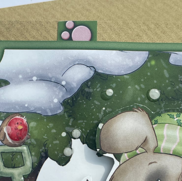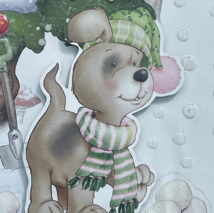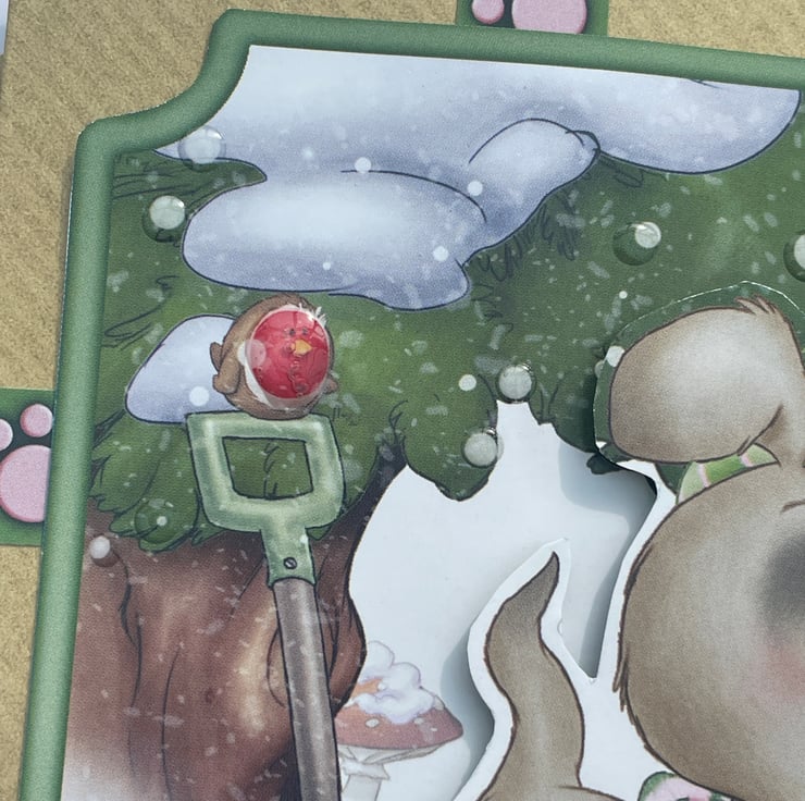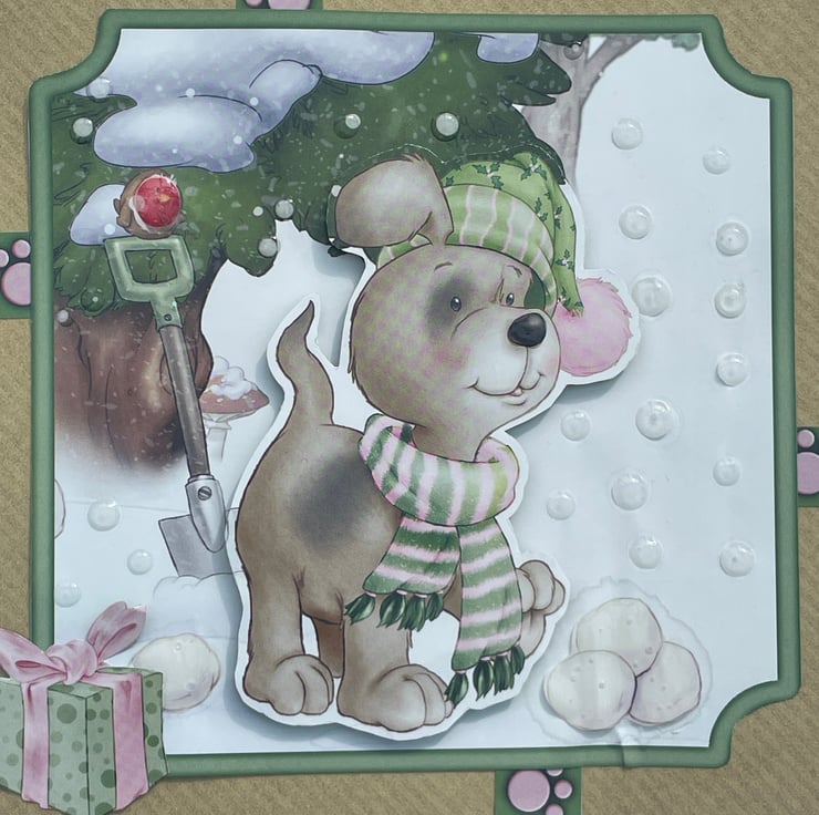 A cute doggy to brighten Christmas. This 12.5x12.5cm craft card features a cute dog dressed in his winter scarf and hat. He is out in the snow. The design also has a tree, snowballs, a parcel and a spade with the cutest robin on top. Inside the card has the greeting With luv furever making it ideal for christmas but could also be used for a winter birthday. A fun little card.