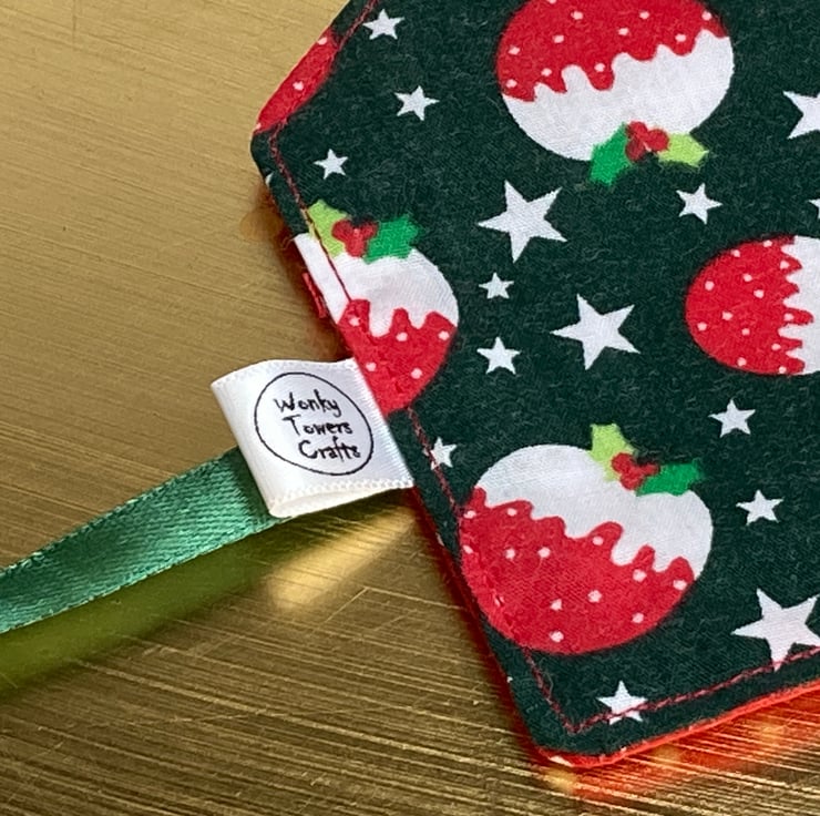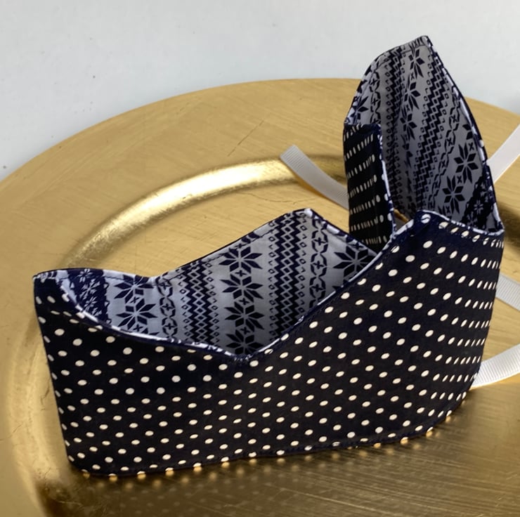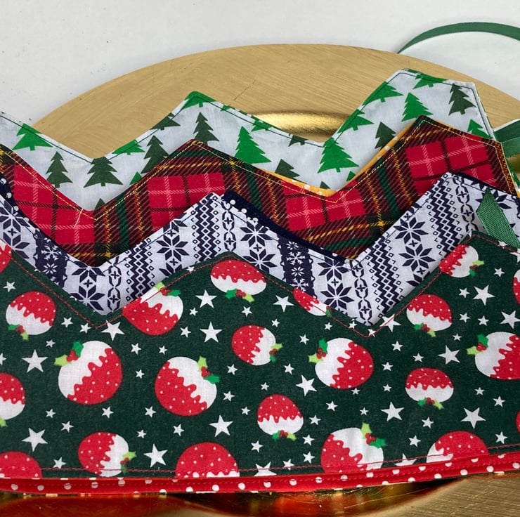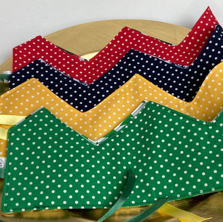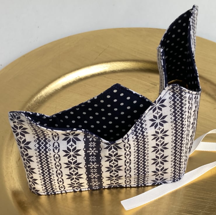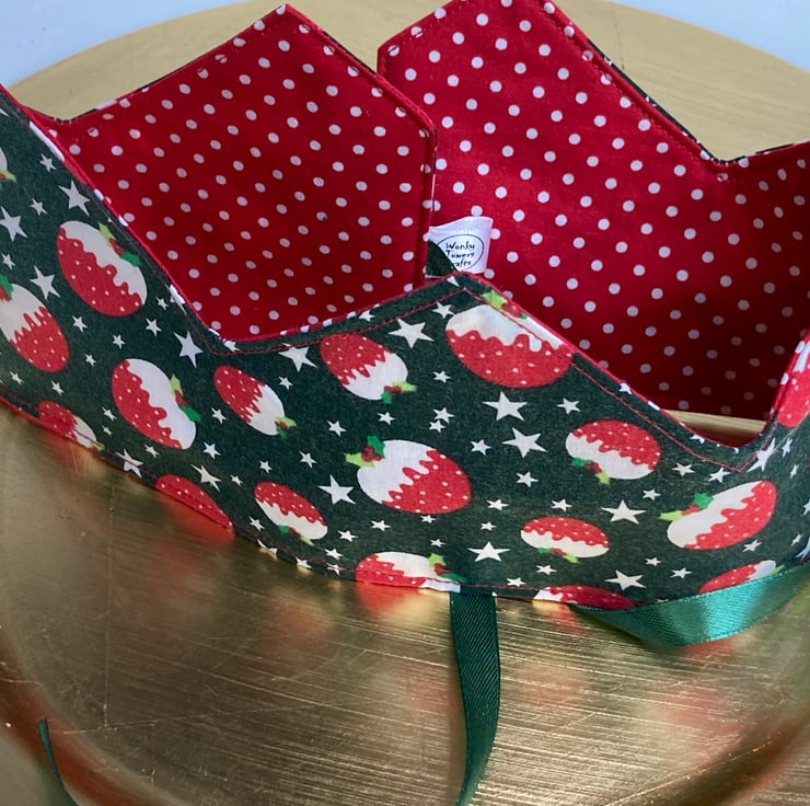 Our crown are carefully made with soft interfacing sandwiched between 2 layers of fabric. The party side comes in red, green, navy or yellow spotted fabric. The Christmas sides show Christmas puddings, Christmas trees, a Scandinavian print and red tartan.They are topstitched in coordinating thread and fasten with ribbons. The colour of the ribbons may vary but will suit the fabrics. Crowns measure approximately 50cm long, stand 9cm high and will comfortably fit averaged adult head sizes.