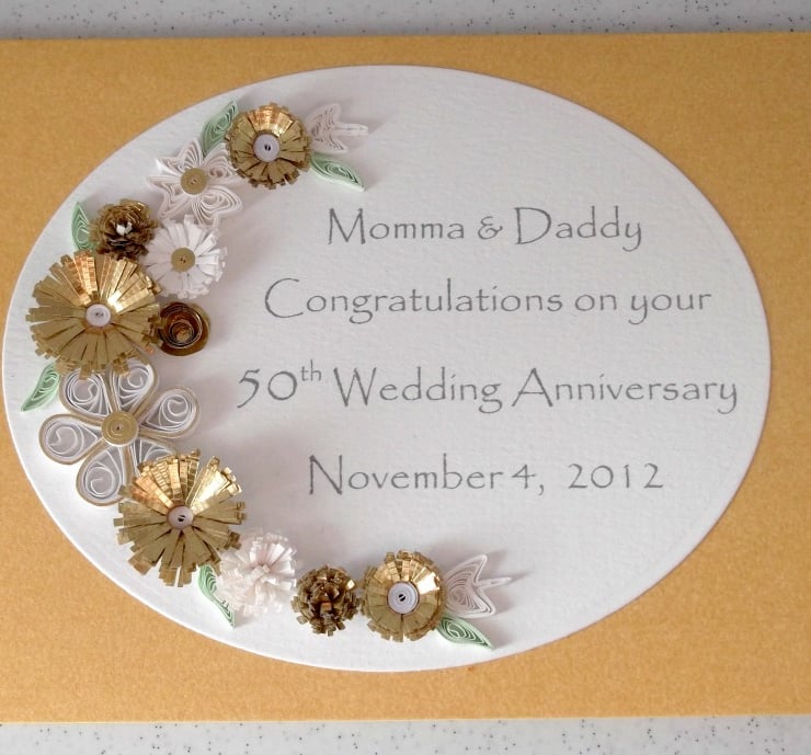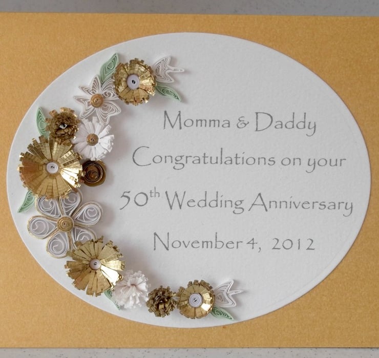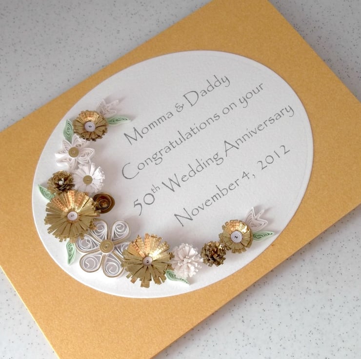 A 50th golden wedding anniversary congratulations card with handmade quilled flowers