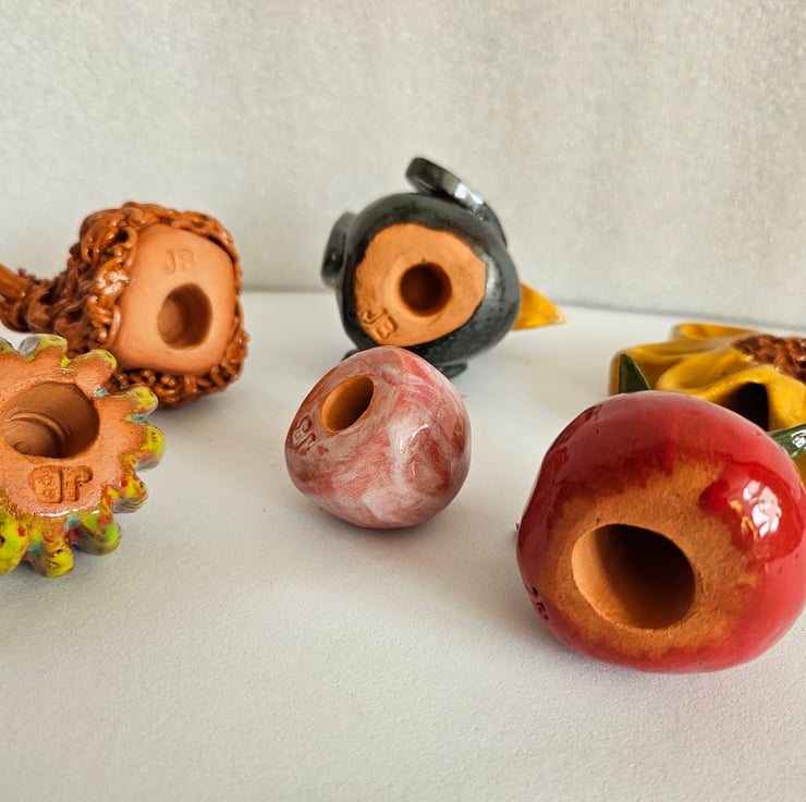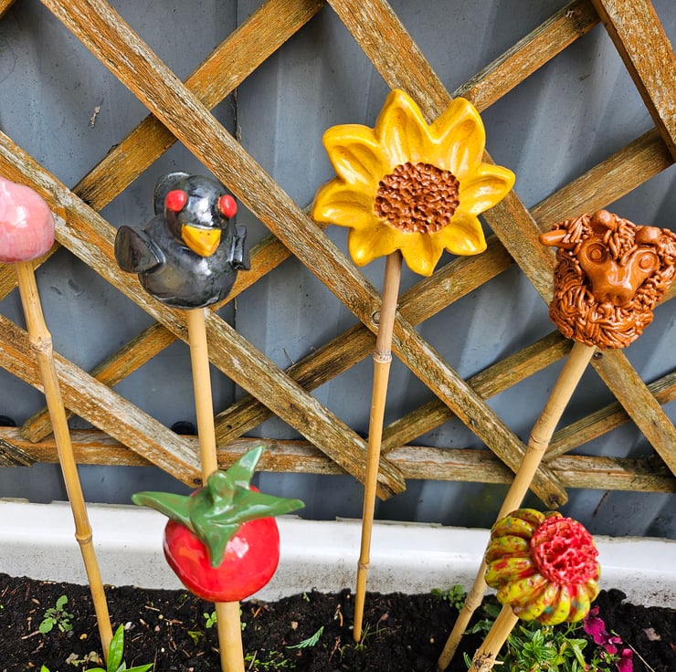 Cane Tops for your garden. Made from red earthenware clay, all glazed to suit the subject! Last for years and years in all weathers in your garden. These individuals consist of Sunflower; Cow; Tomato; Blackbird' Onion & a Cactus. I use a variety of different bamboo canes to give a variety of hole sizes to fit bamboo canes. One Set of 6 Cane Tops.