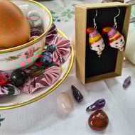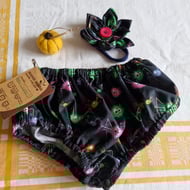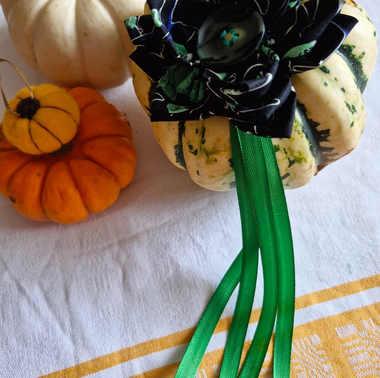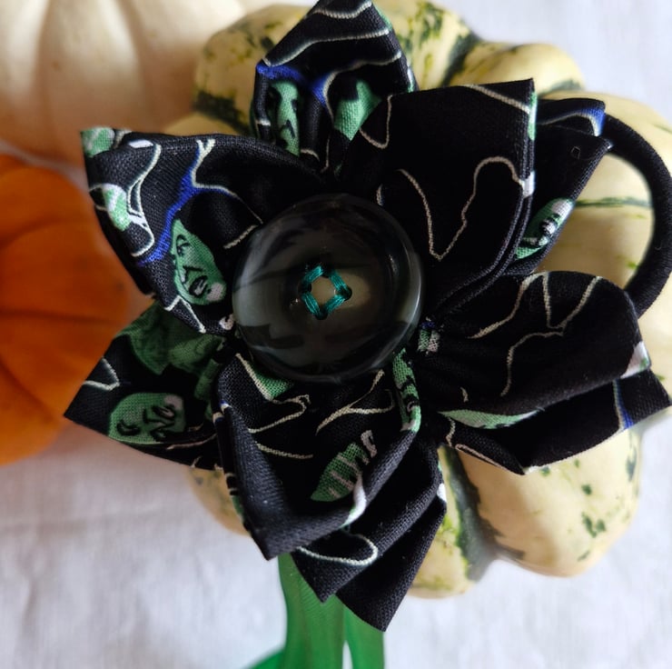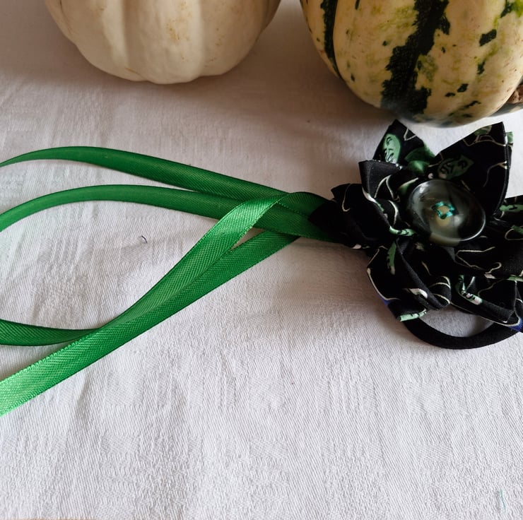 This handcrafted hair bobble and headband features a charming fabric flower with a black and green" Wicked Witch "print , making it a fun and seasonal accessory. The petals are gathered to give it a full, dimensional look, and its centred with a large, glossy vintage black button. A double strand of vibrant green ribbon hangs from the side, adding a pop of colour and extra flair. This versatile piece is designed to be worn as either a headband for a child or a hair bobble, perfect for adding a touch of magic to any outfit.