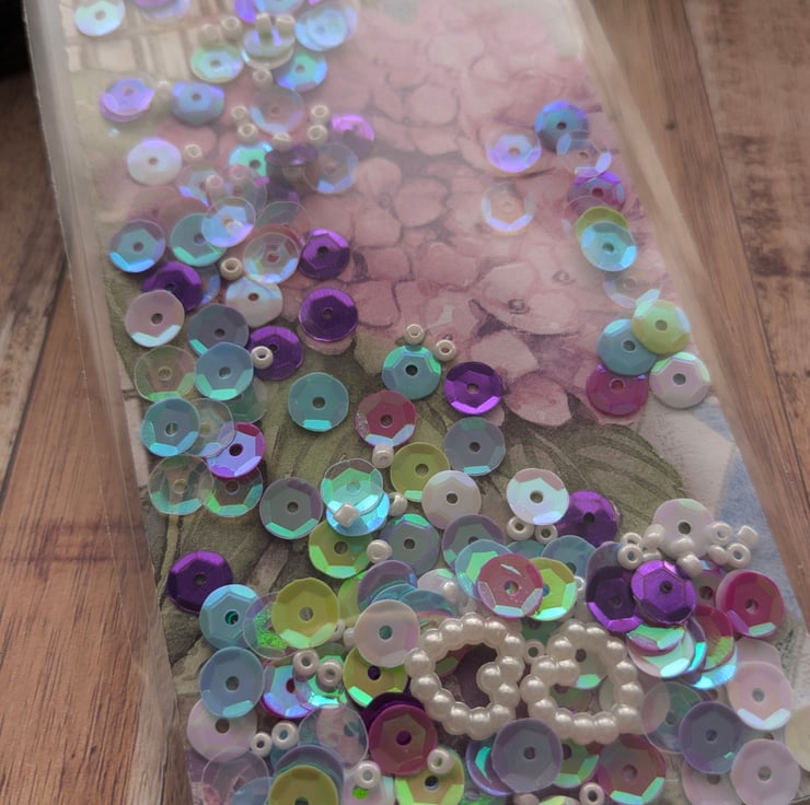 It measures approximately 2.5 x 7.5 inches, it has a lilac tassel and is filled with the most adorable sparkly elements, tiny beads , stars , pearl hearts and sequins in shards of white , pastel green and pale lilac.