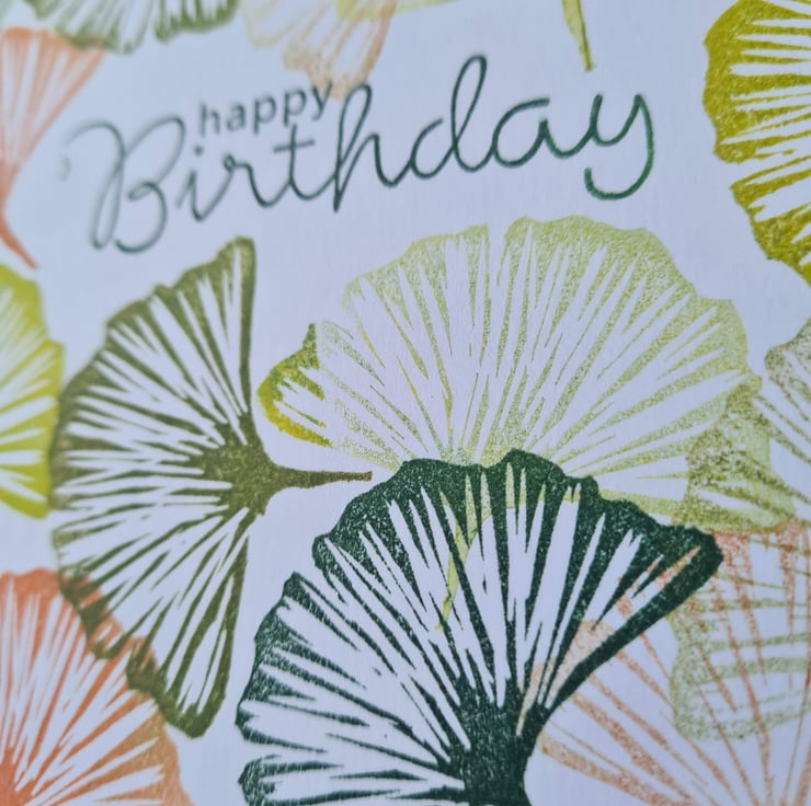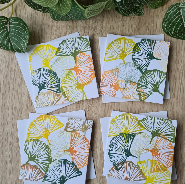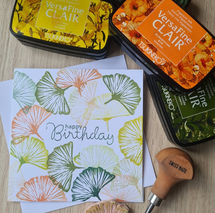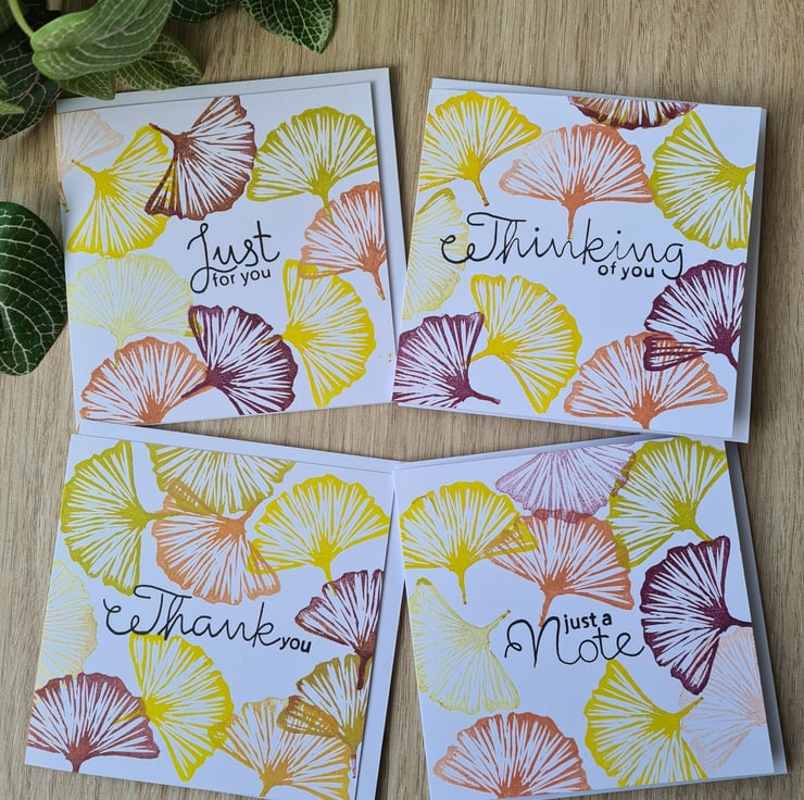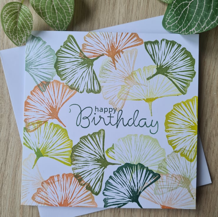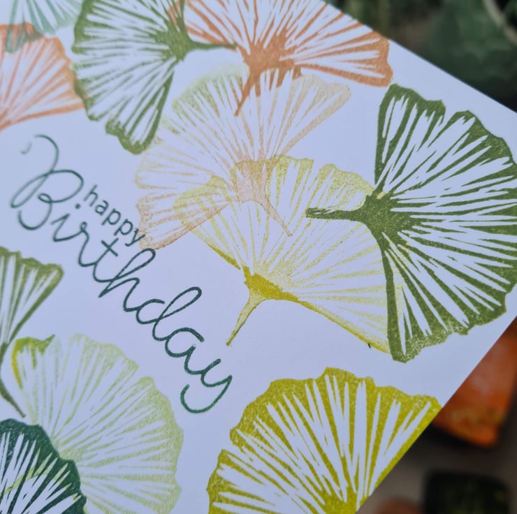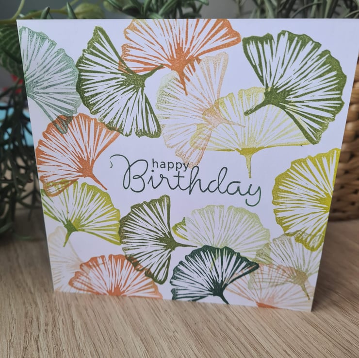 I have handprinted this card in a pretty gingko leaf design using a stamp I designed and carved myself, and using quality ink pads in a natural colour palette. I handstamped with text to finish. It's lovely to give a unique handmade card and this would be perfect for a gardener, nature lover, and friends and family.
