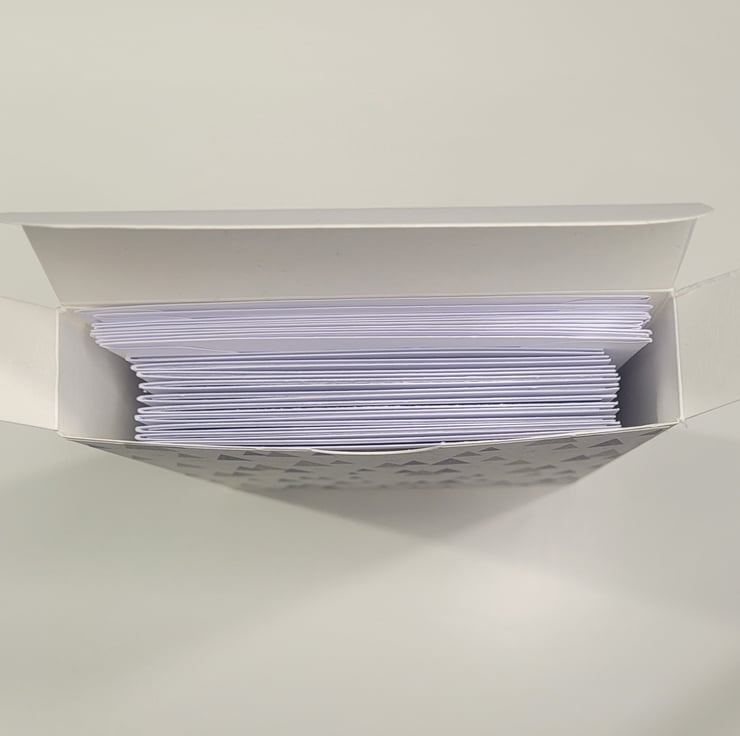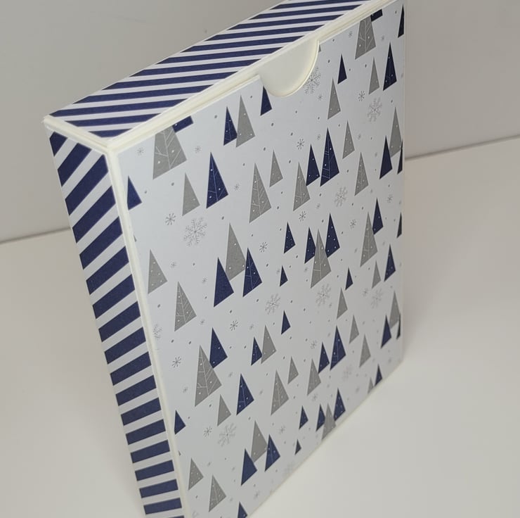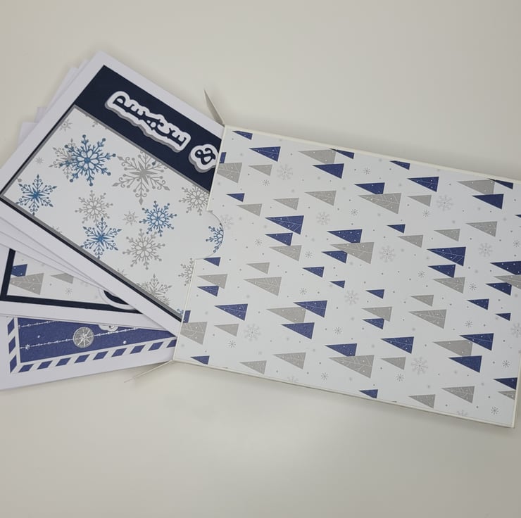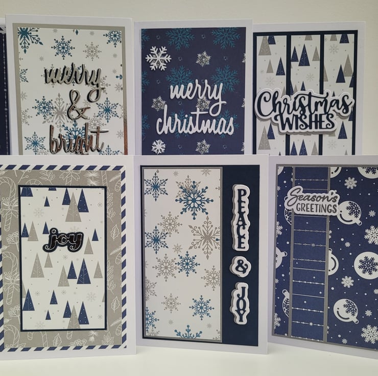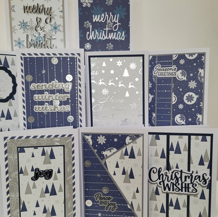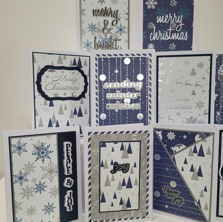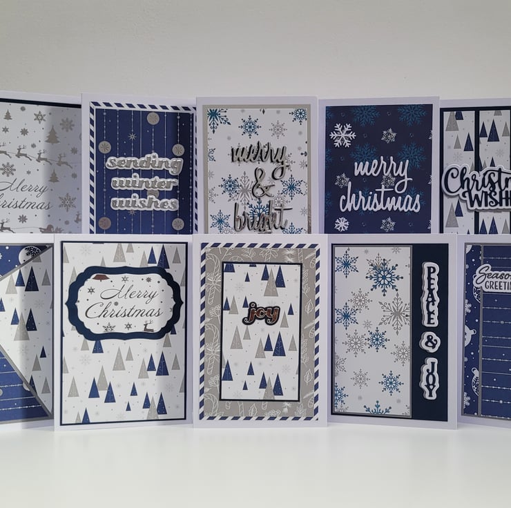 A set of 10, handmade Christmas cards each featuring a different Christmas sentiment on the front in a cool blue, white and silver colour scheme. Perfect for your own use to send Christmas greetings, or as a gift for someone else to utilise.