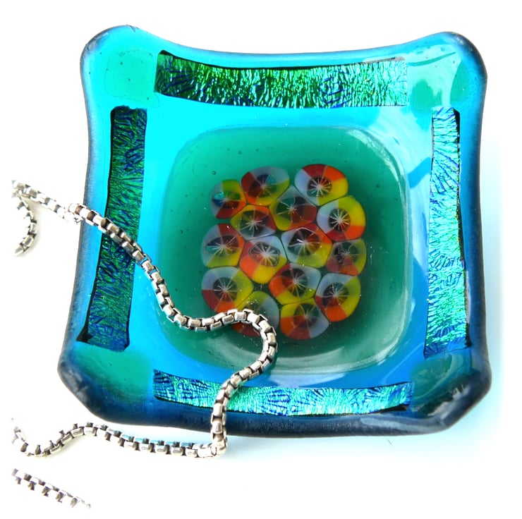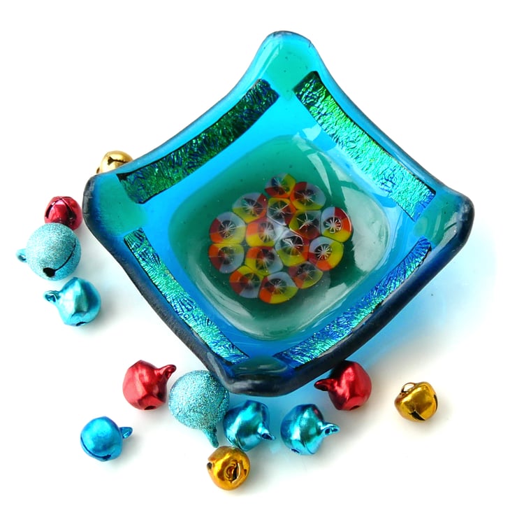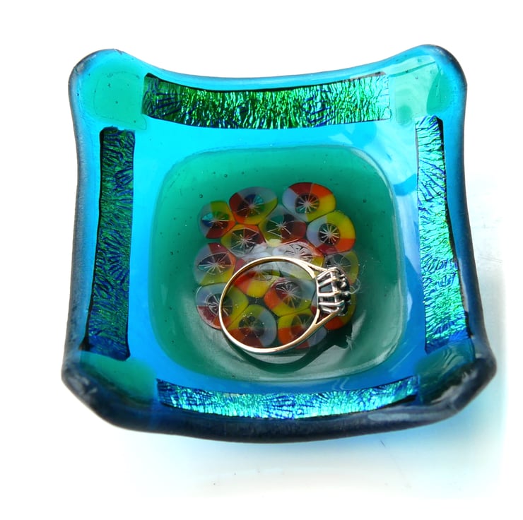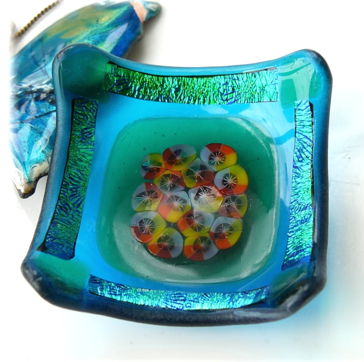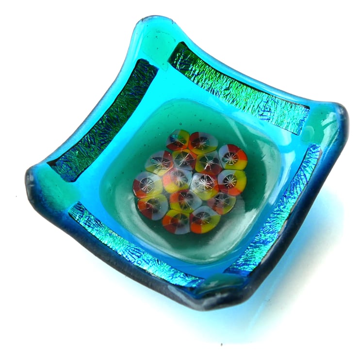 A 7cm square dish, twice fired in my kiln, first to fuse all the glass together, 2nd to slump it over a little mould to make a deep little dish.