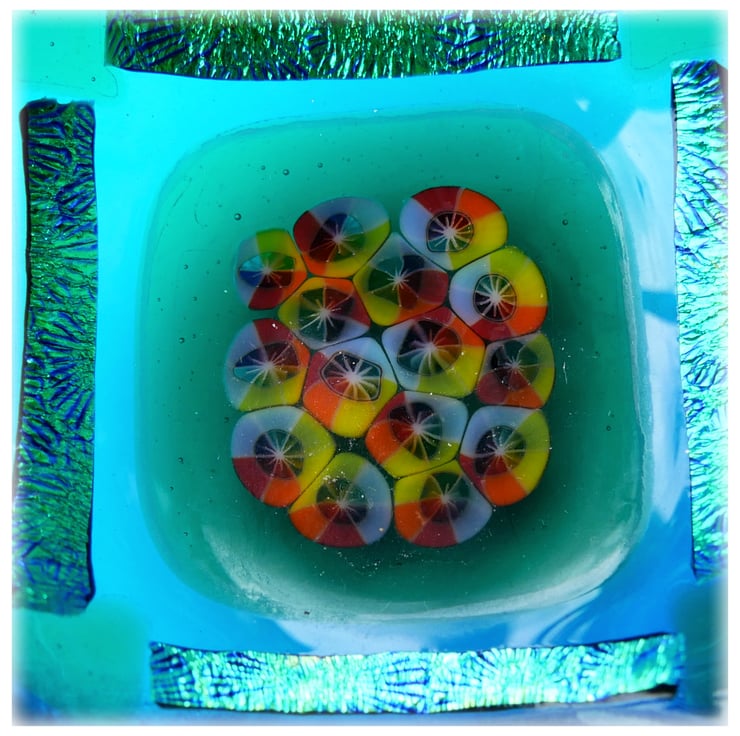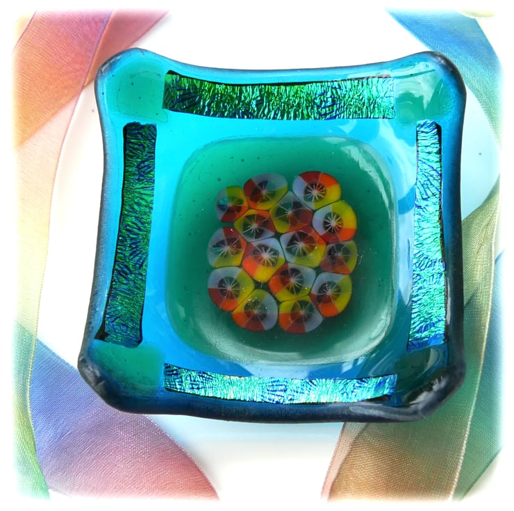 This little dish is on a base of bright Emerald glass topped with a different Emerald centre in which I have encased pretty millefiori sices. I've added side borders of textured dichroic glass.