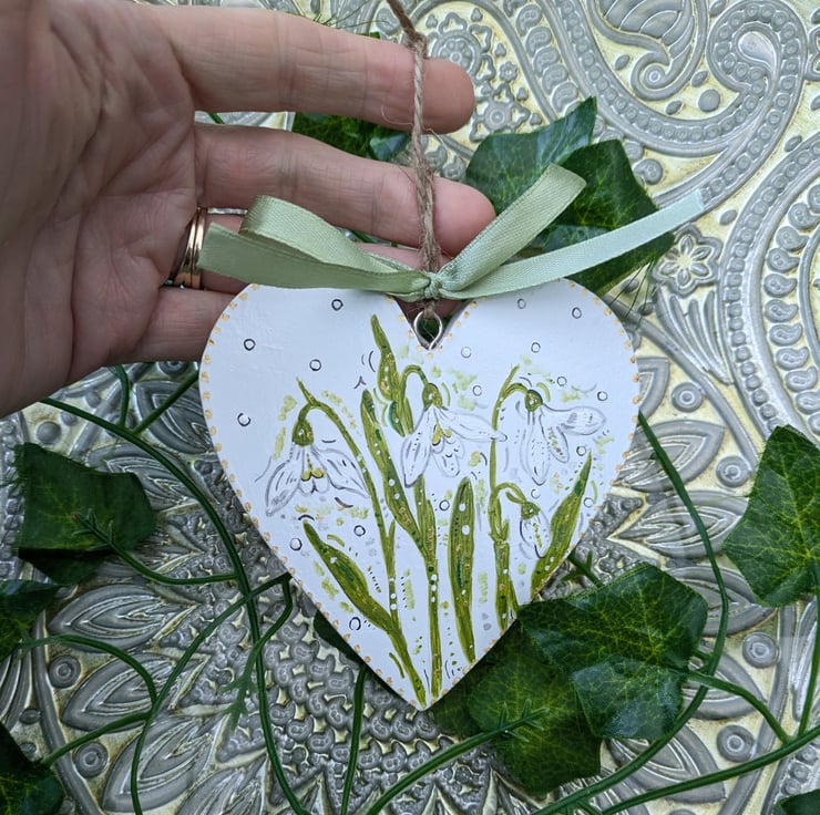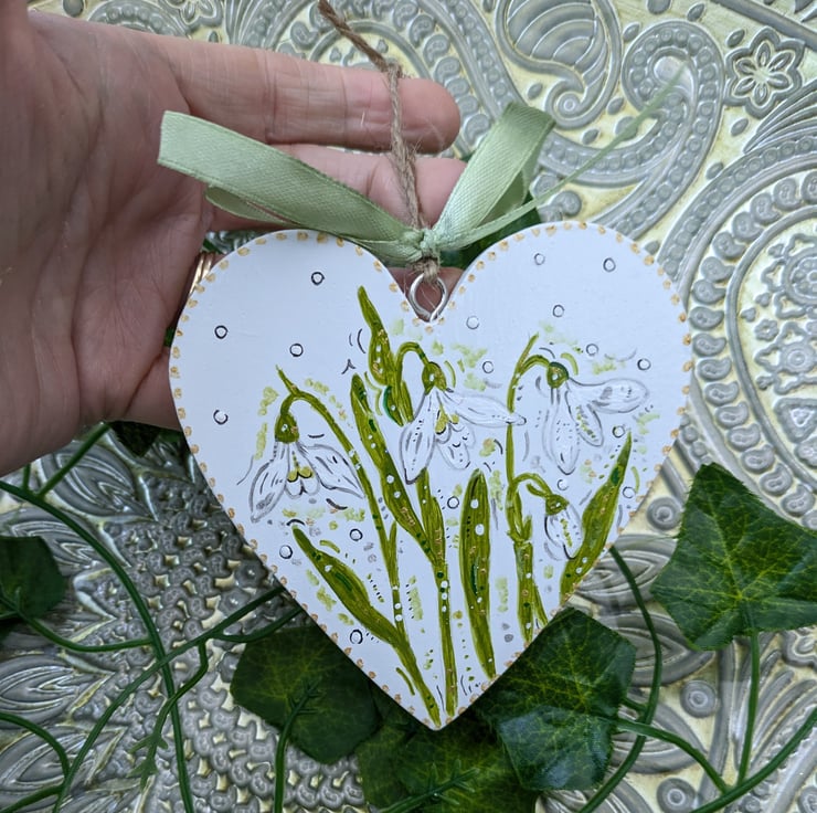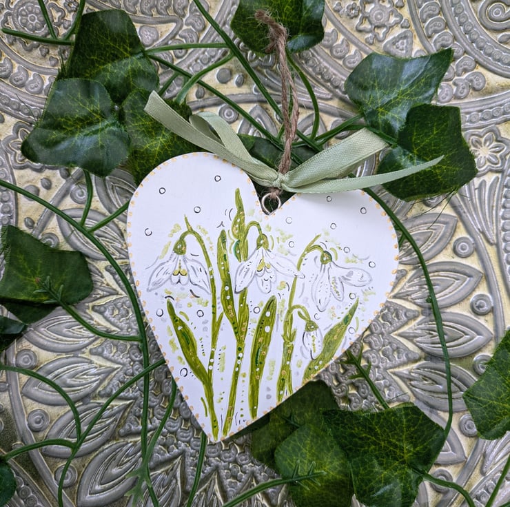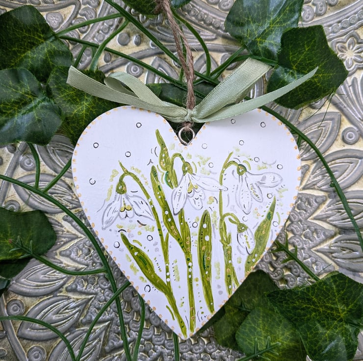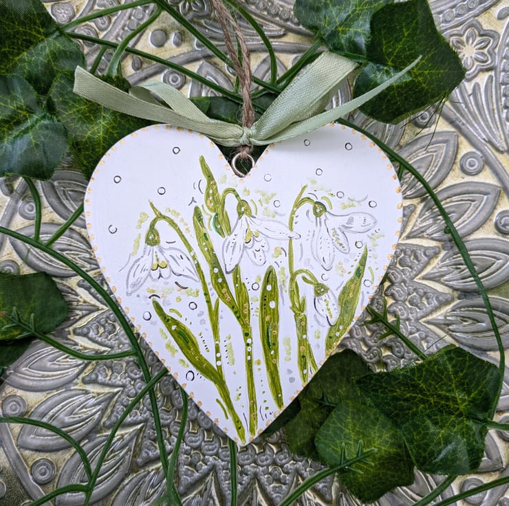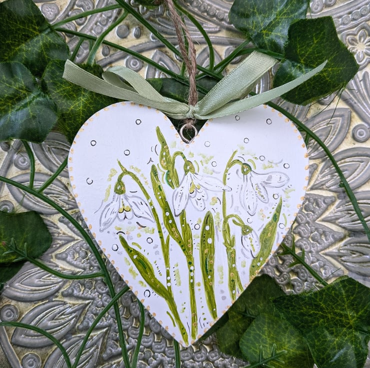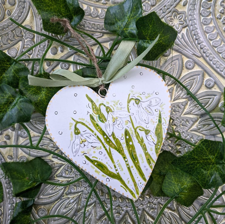A beautiful hand-painted Snowdrop wooden heart decoration. This special heart would make a lovely gift for anyone celebrating a January birthday as Snowdrops are the birth flower for this month