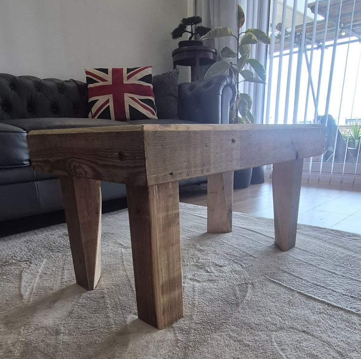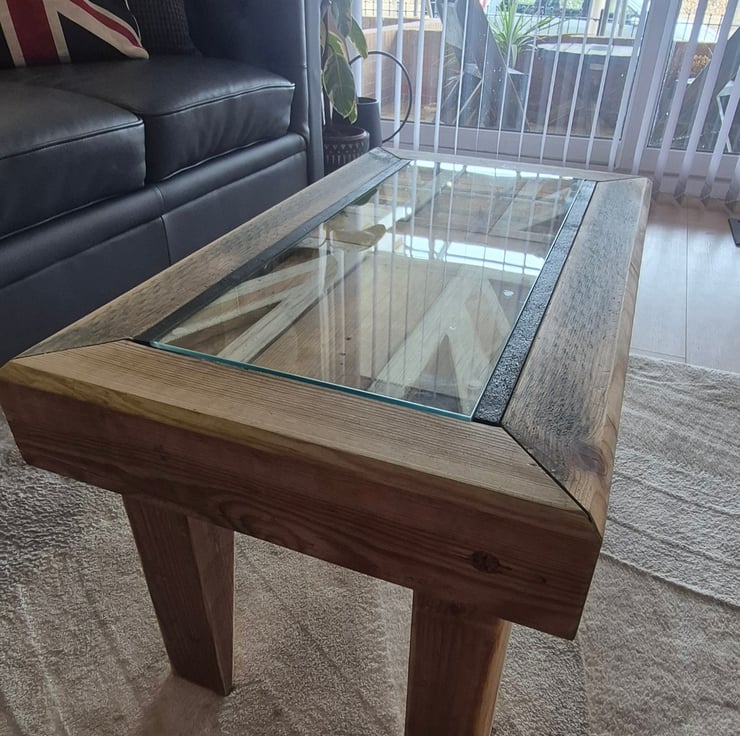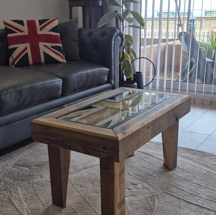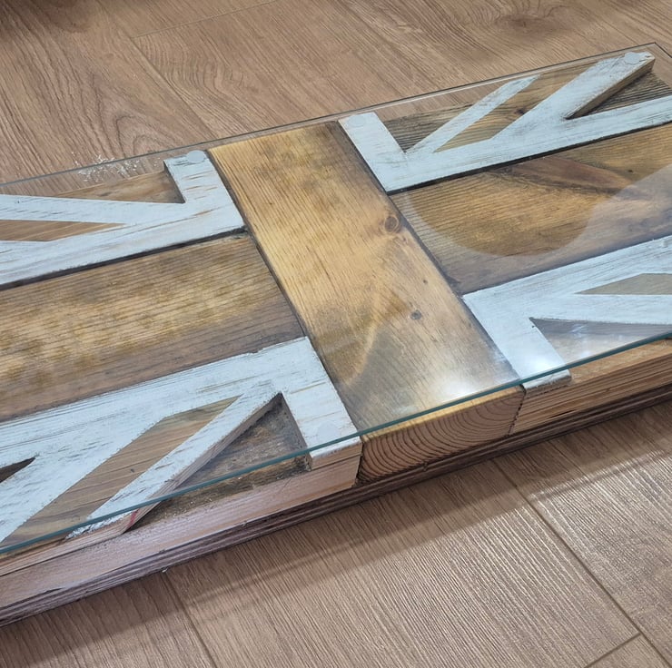Handmade wooden coffee table with union jack design and glass top. Made with reclaimed timber. One off bespoke piece. Made using hand tools.