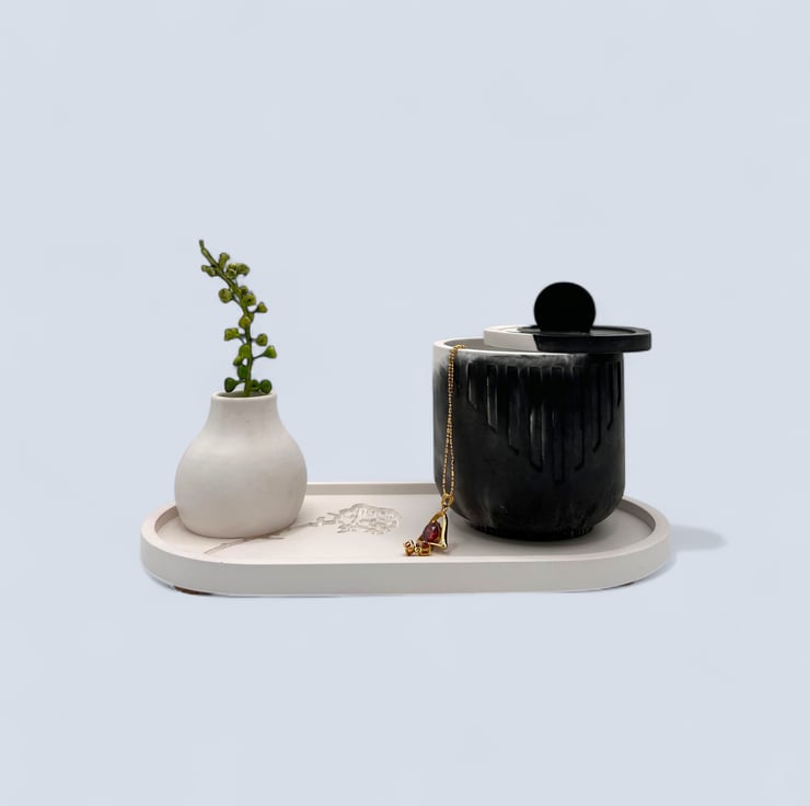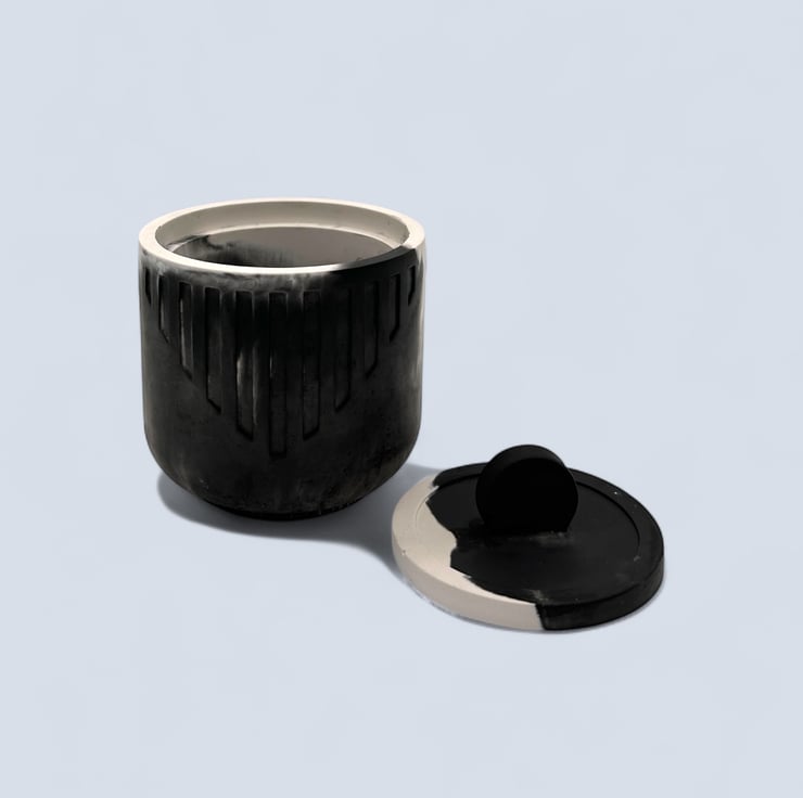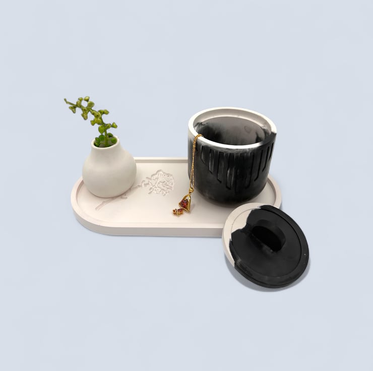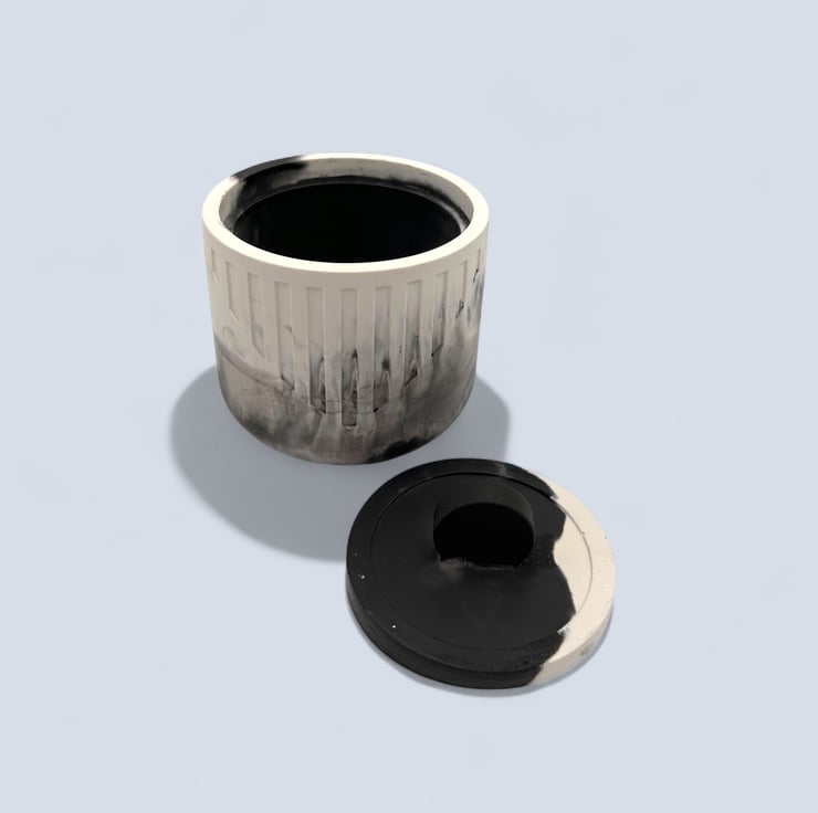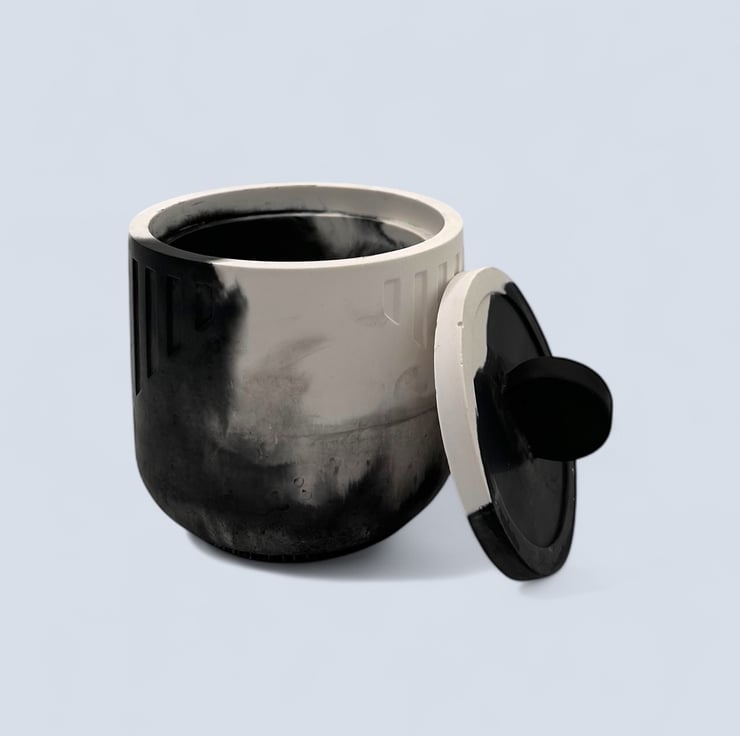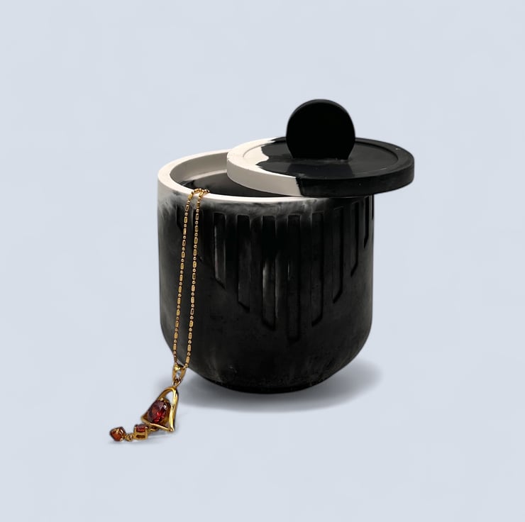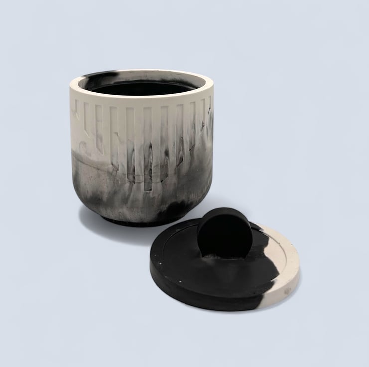 I was drawn to the simplicity and drama of black and white when I created this jewellery box. By mixing plaster in two contrasting tones and pouring it into the mould, I let the materials interact and settle into their own unique patterns. Each pour tells a different story, creating bold, abstract markings that can never be repeated.